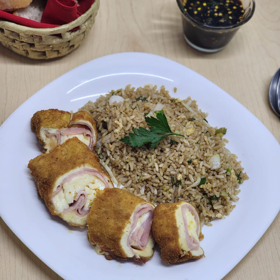 Pechuga Empanizada rellena de champiñones salteados con Queso Philadelphia acompañada de pasta y papas a la francesa