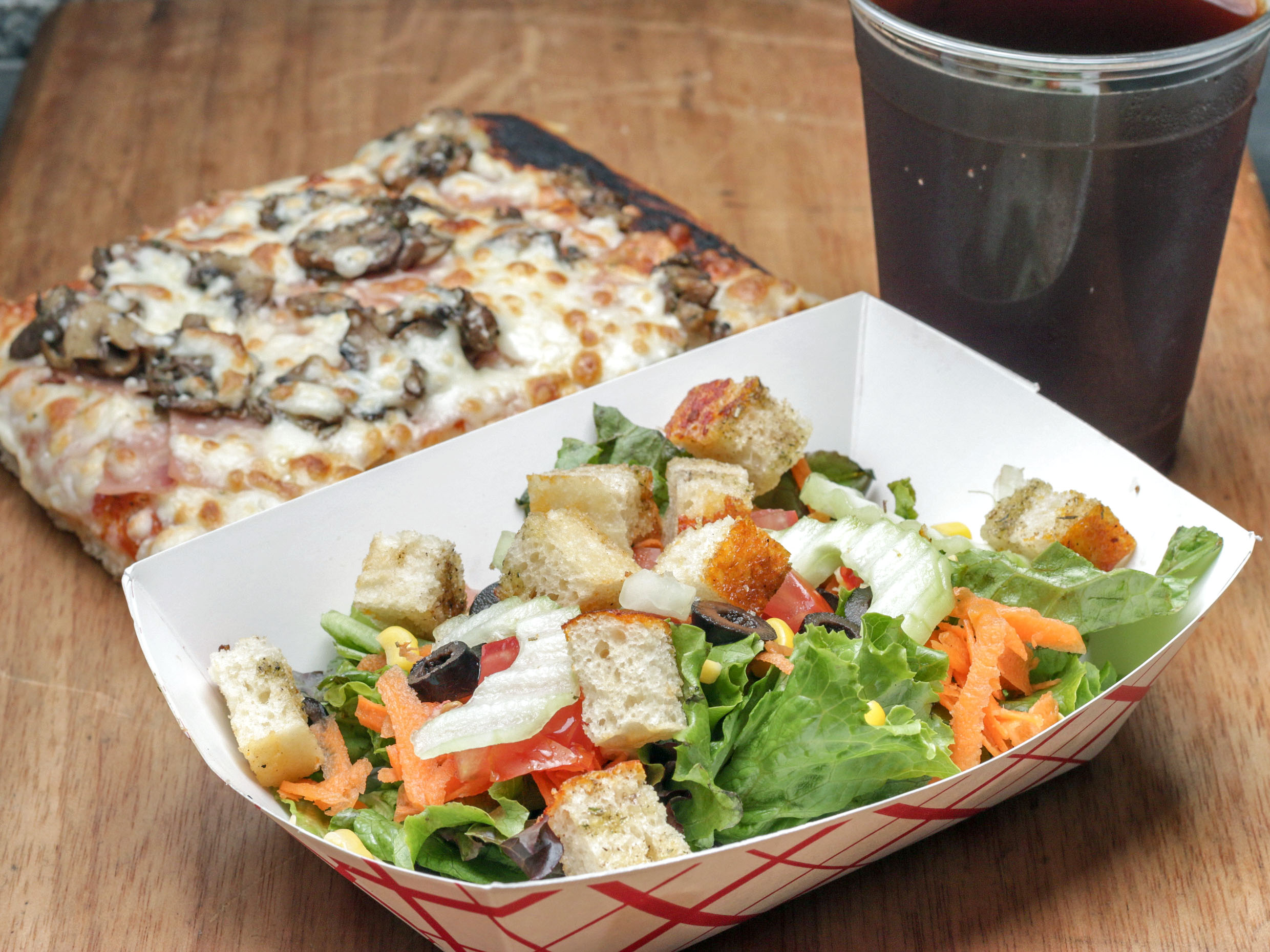 Focaccia margarita más ensalada mista y bebida.