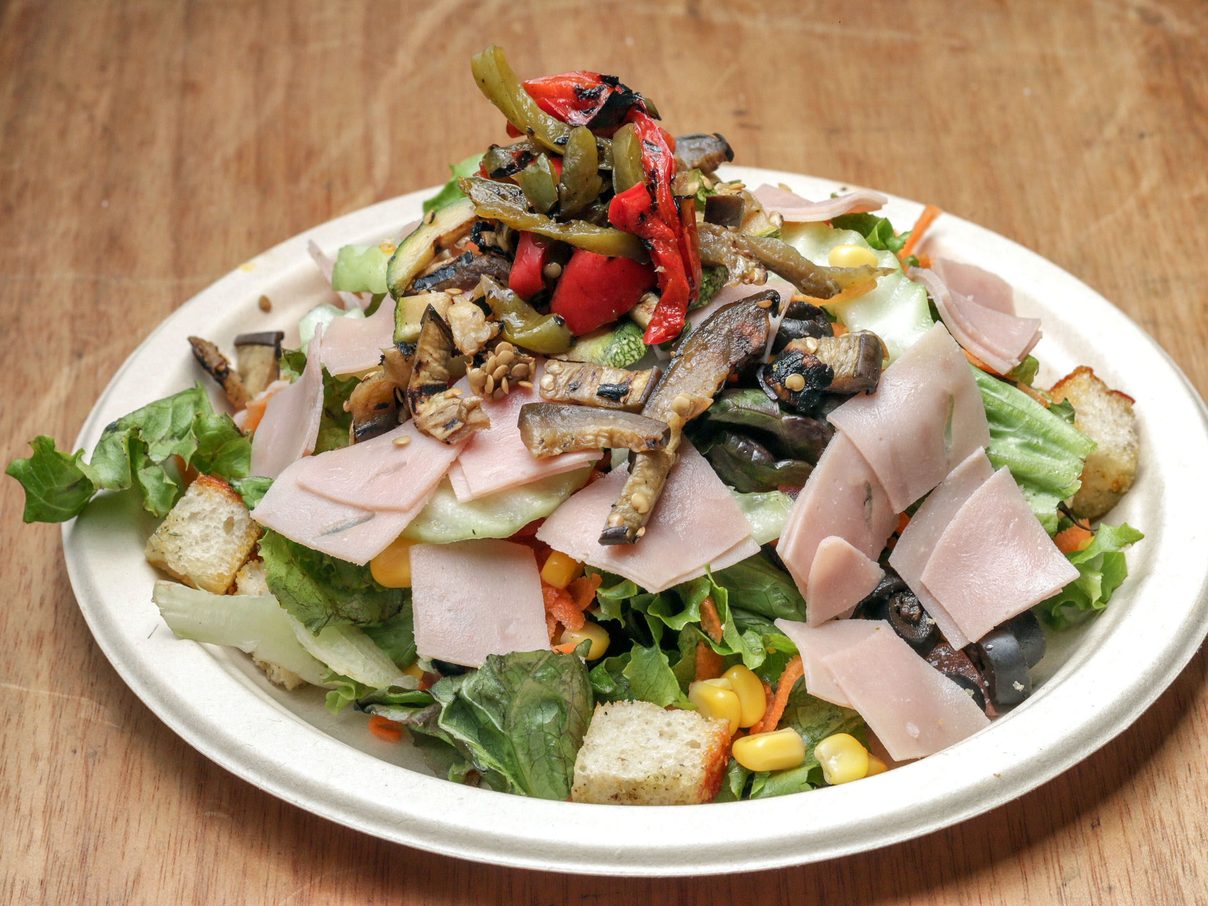 Ensalada con mix de lechuga , elote amarillo, aceitunas negras, jitomate, pepino, zanahoria rallada encima con verduras al grill, jamón y vinagreta de la casa.