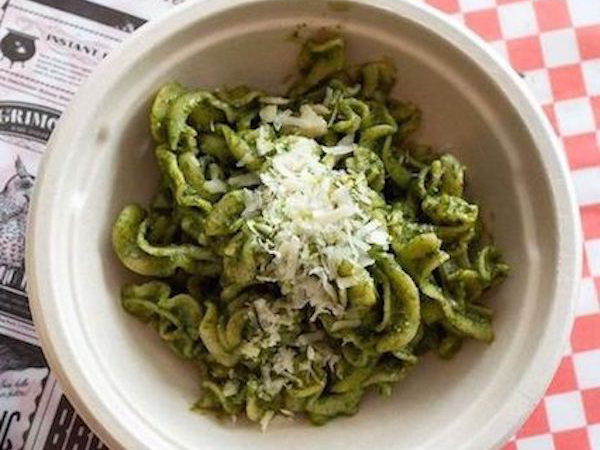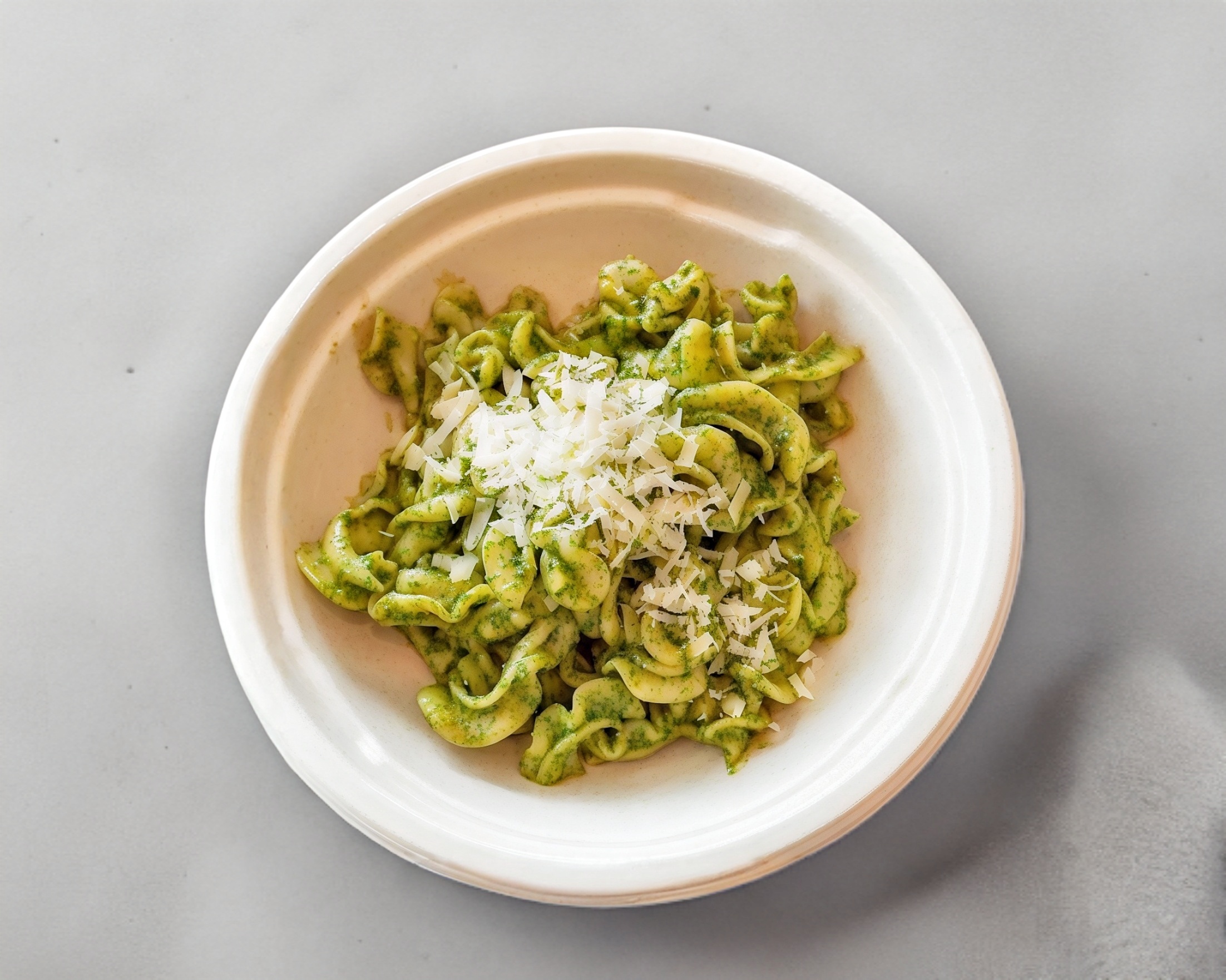 Pasta con albahaca, queso parmesano, piñón, almendra y aceite de oliva.