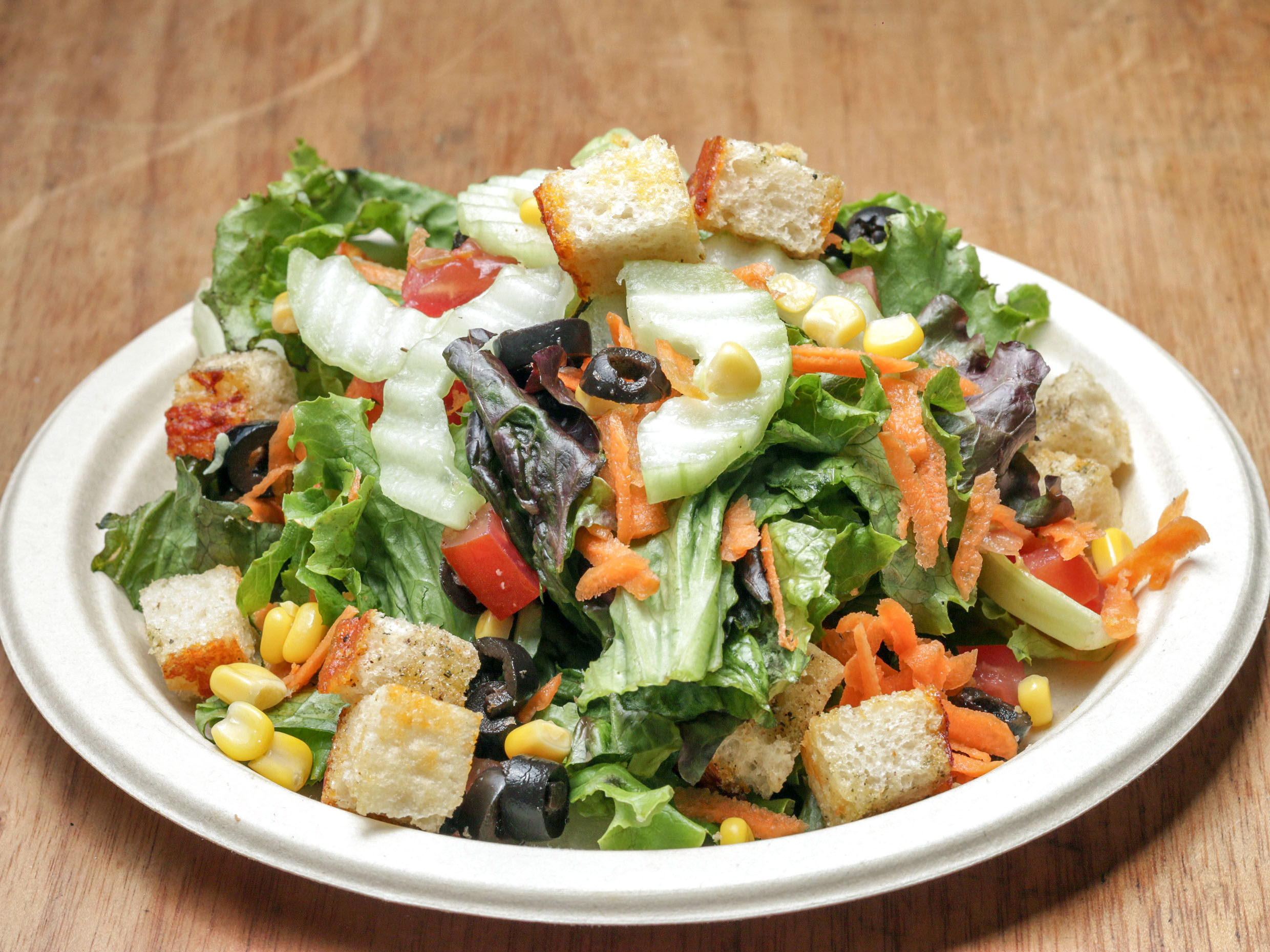 Ensalada con mix de lechuga, elote amarillo, aceitunas negras, jitomate, pepino, zanahoria rallada y vinagreta de la casa.