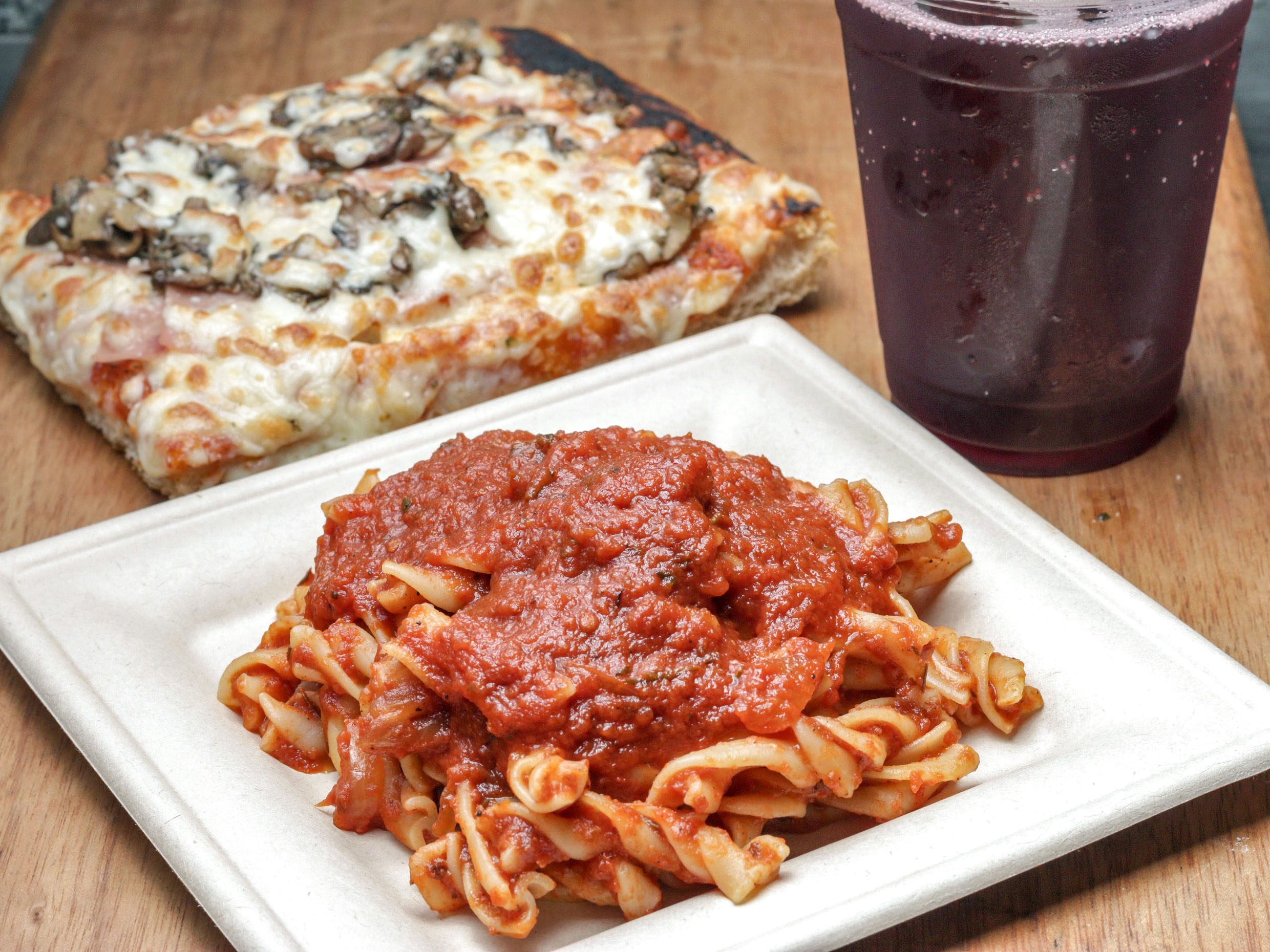 Pasta pomodoro más focaccia margarita y bebida.