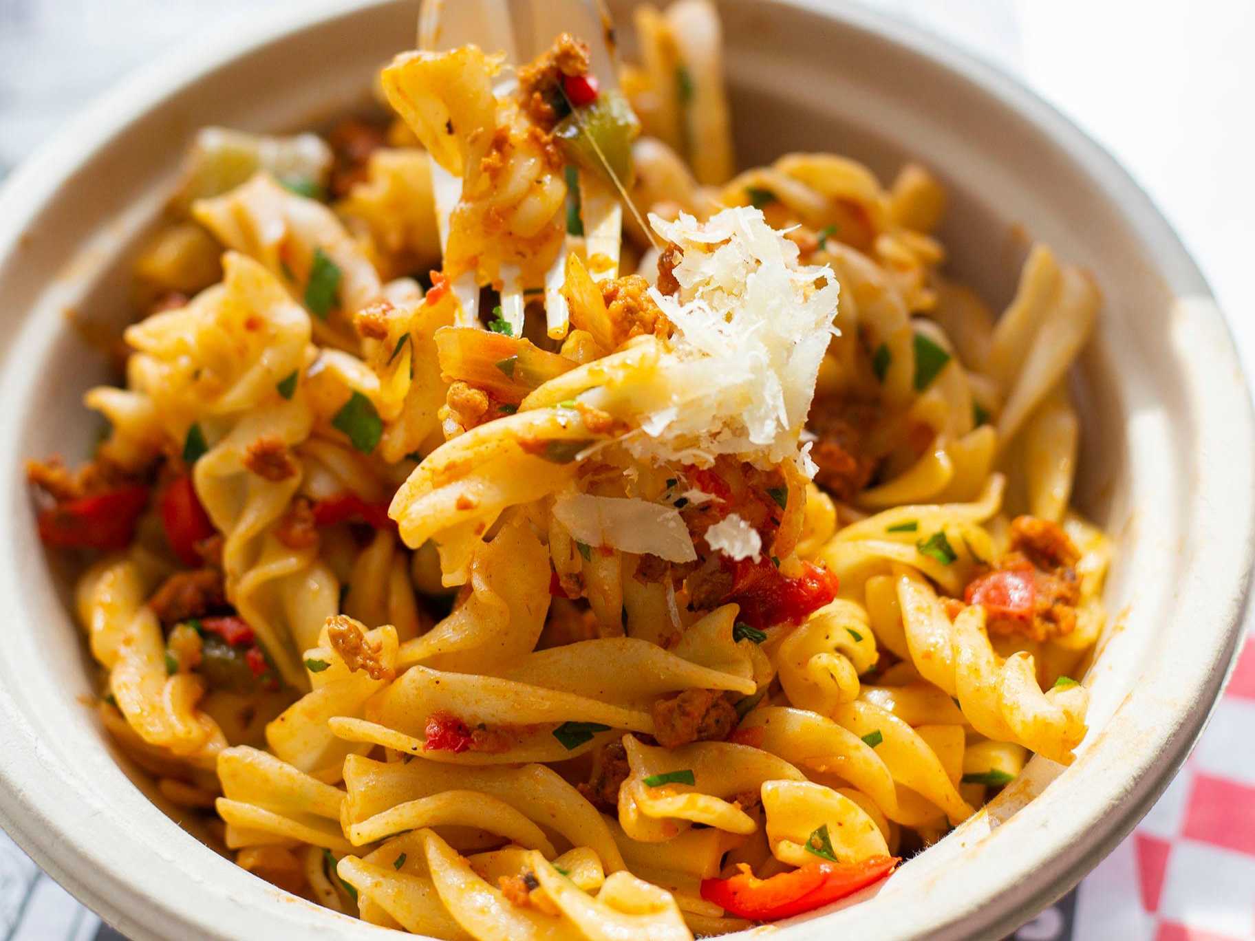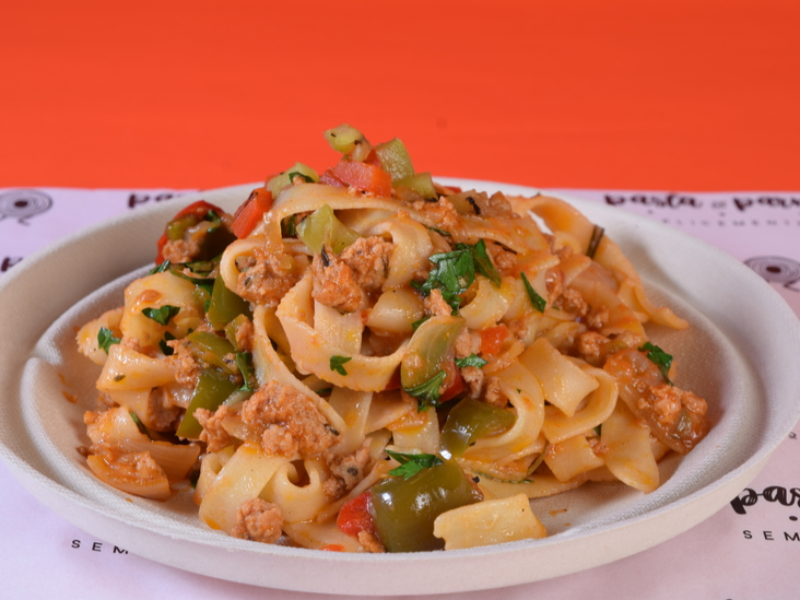 Pasta con carne molida con pimientos y especias.