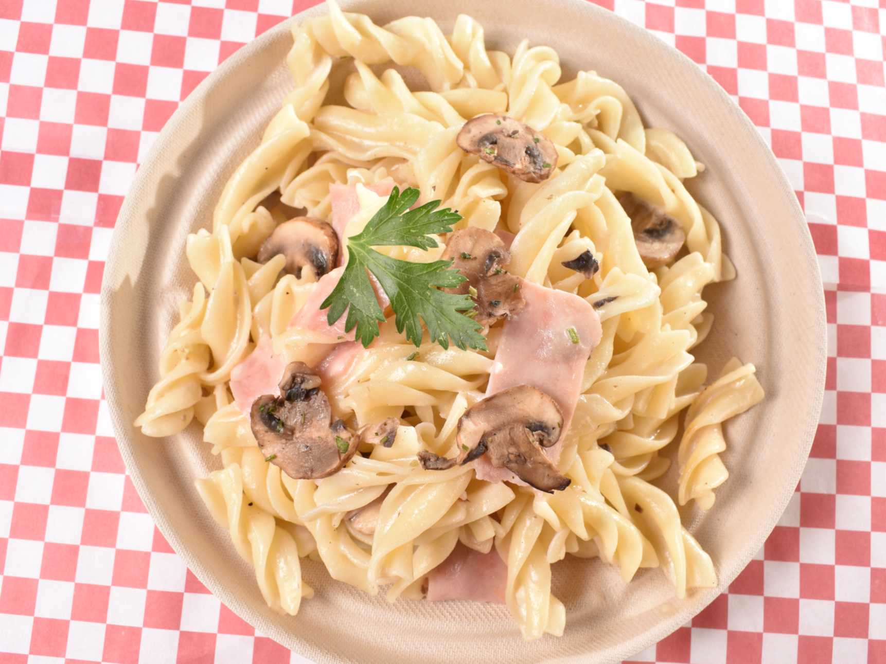 Pasta con crema, jamón y champiñones.