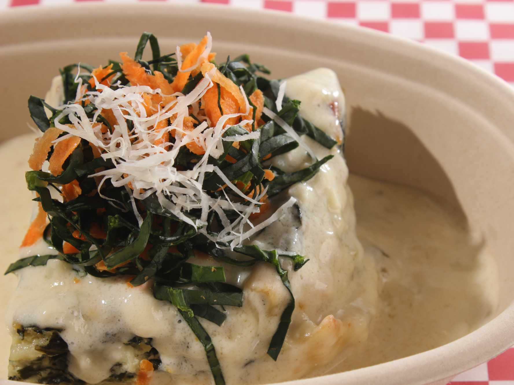 Lasagna con queso ricotta, espinacas y un toque de zanahoria.