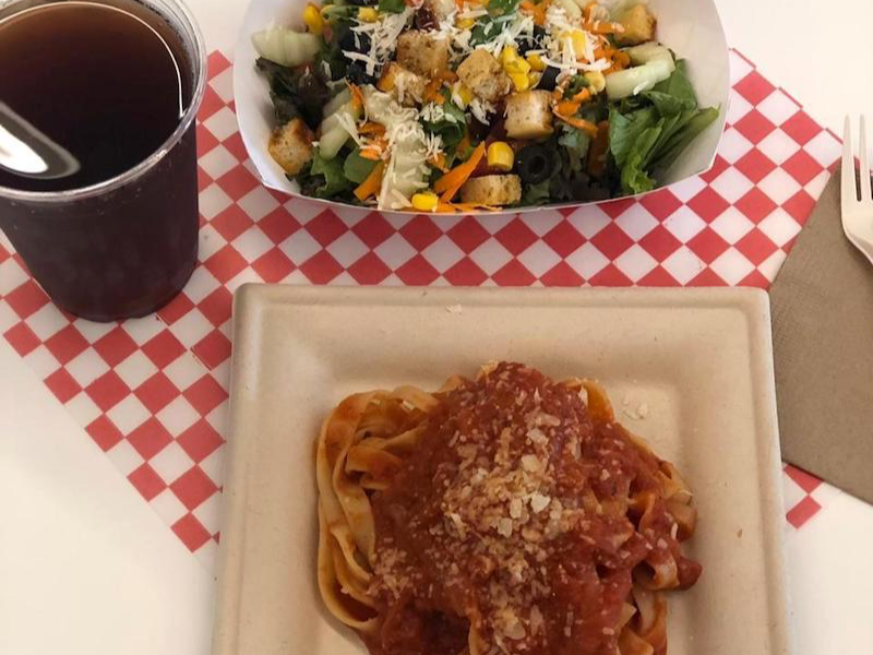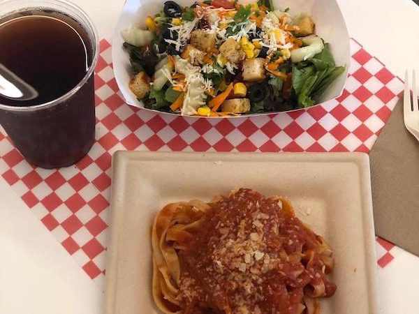 Pasta pomodoro más ensalada mista y bebida.