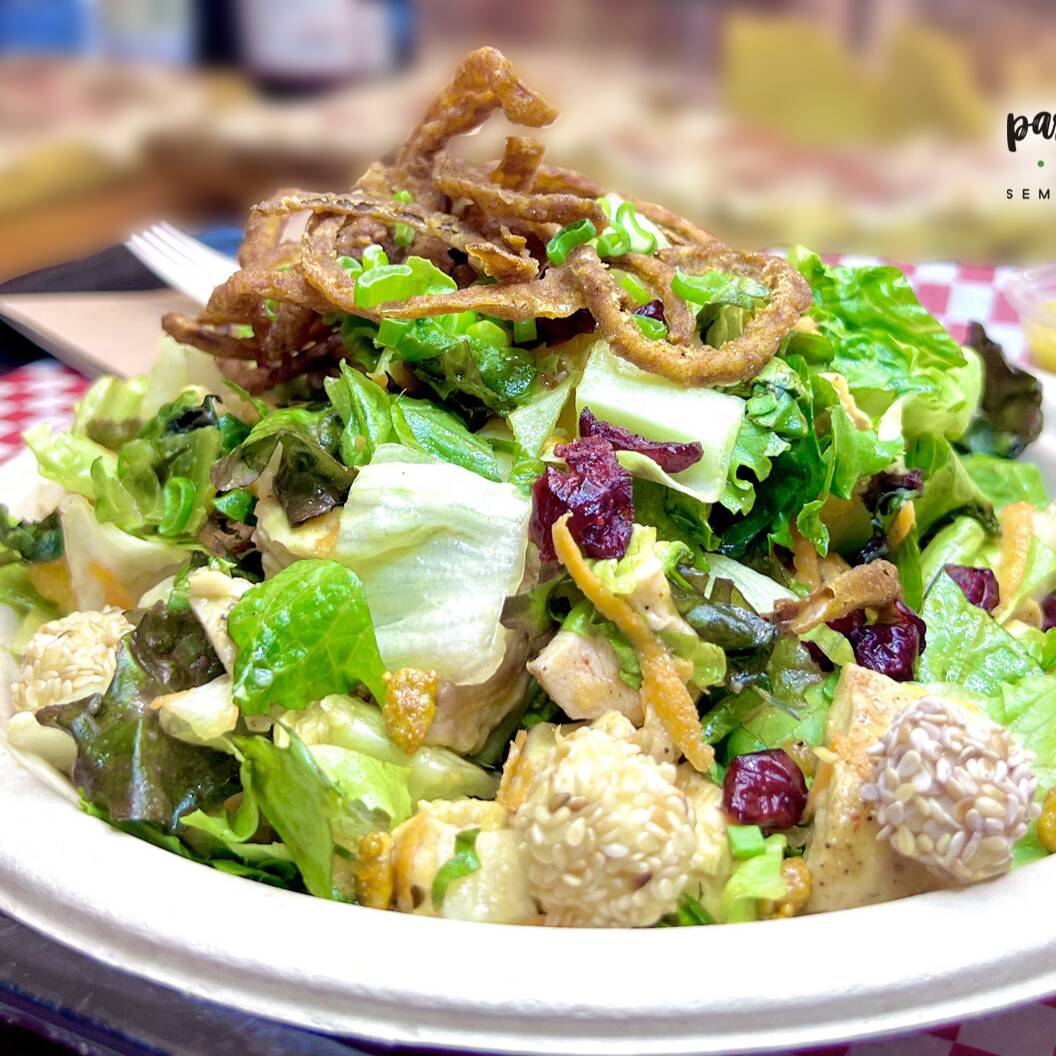 Mezcla de Lechuga, semillas de girasol garapiñadas, bolita de queso crema con ajonjolí, jícama, mandarina, zanahoria, arándanos, cebolla frita rebozada y pollo con un aderezo de mango y jengibre