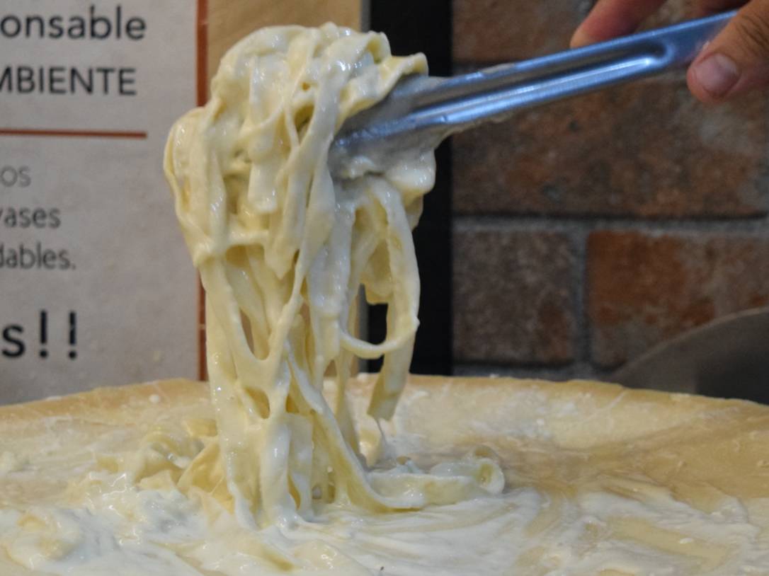 Pasta con la salsa de la casa como nuestro nombre te indica, Se termina de cocinar tu pasta en la rueda de queso parmesano.
