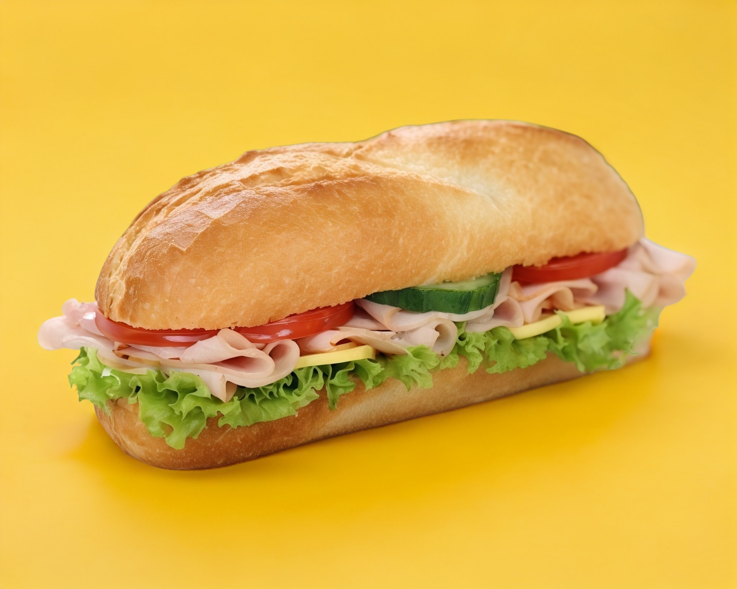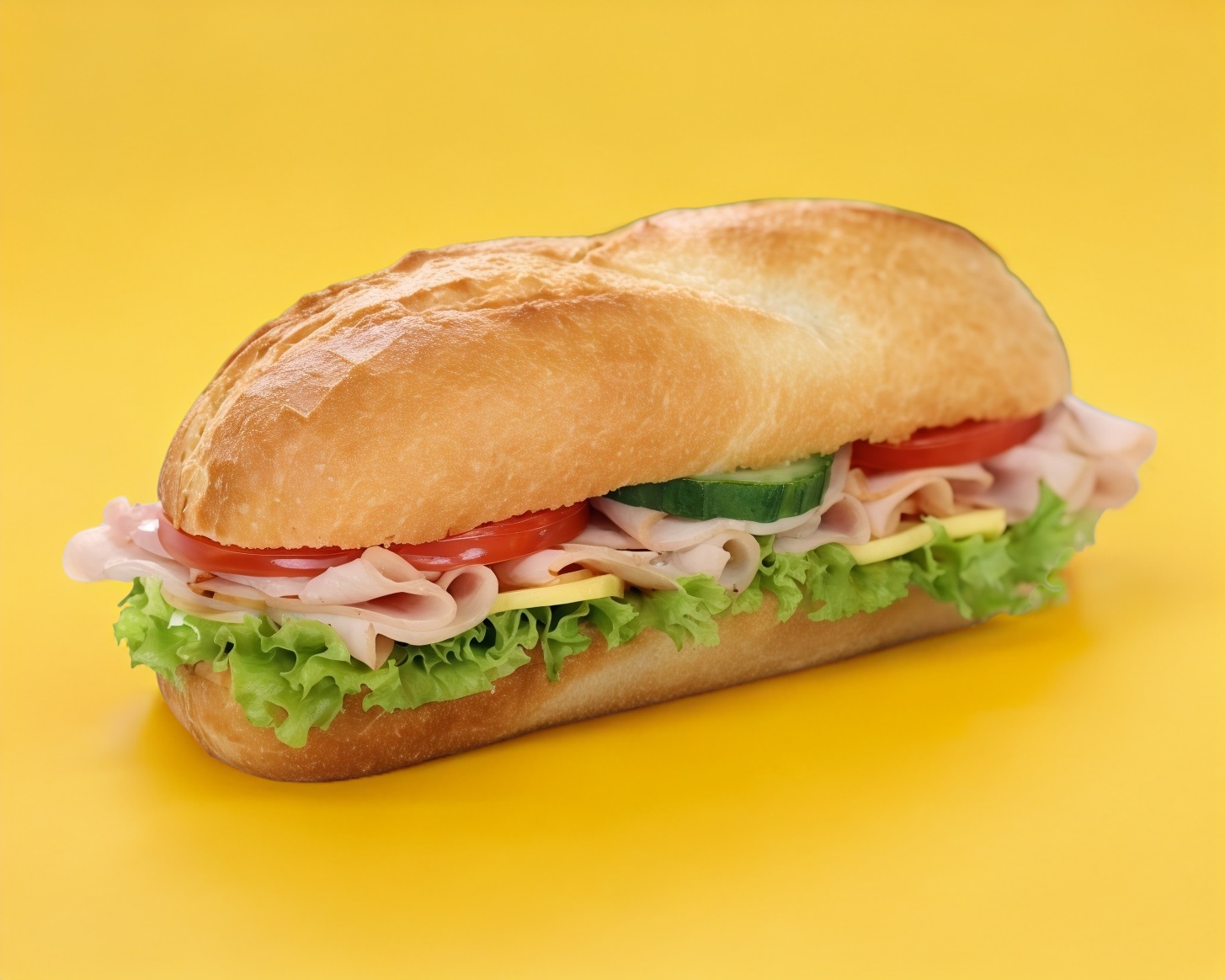 Pan baguette con aderezo de mayonesa y chipotle. Con jamón de pechuga de pavo, queso manchego, lechuga, jitomate, cebolla y guarnición de papas a la francesa