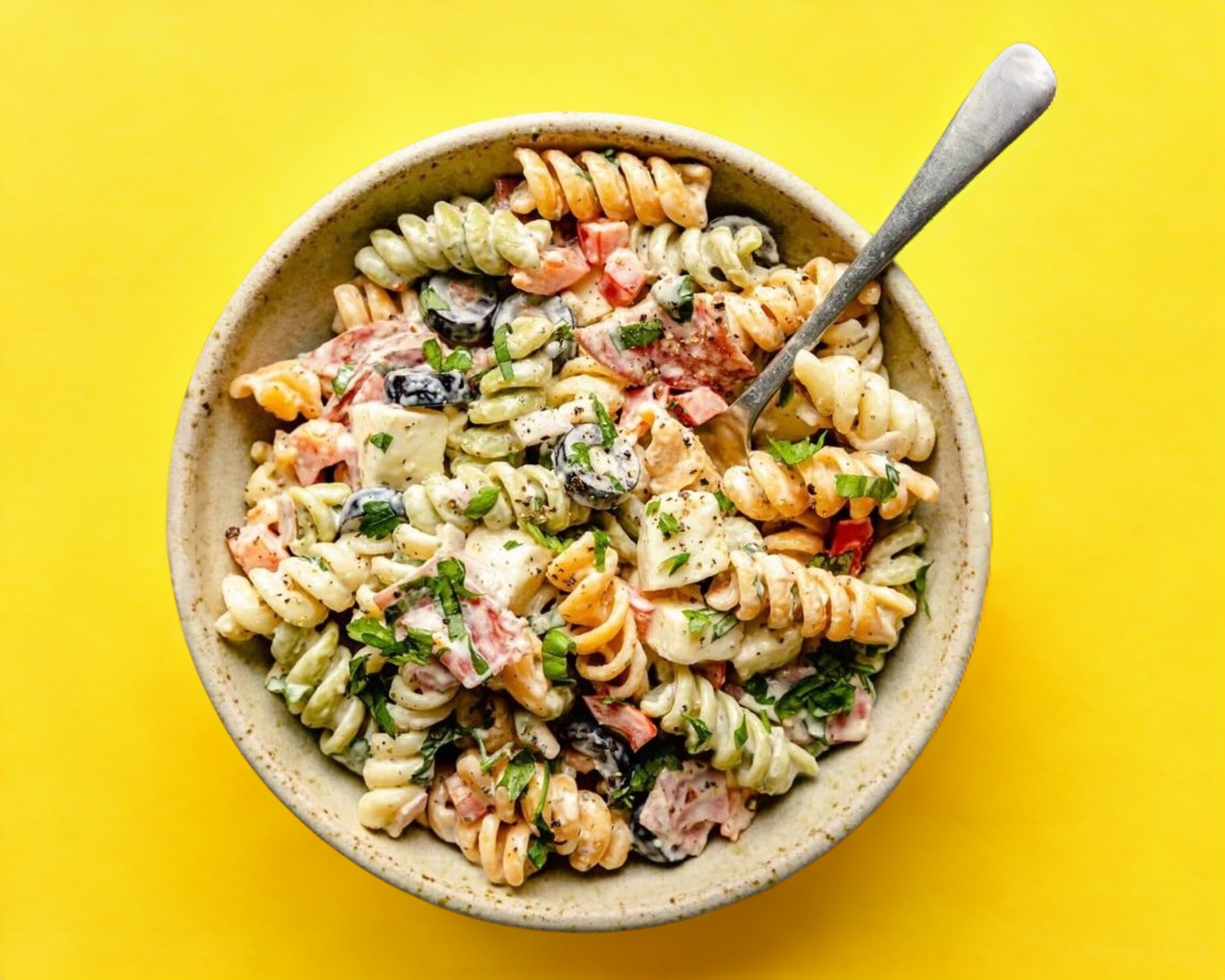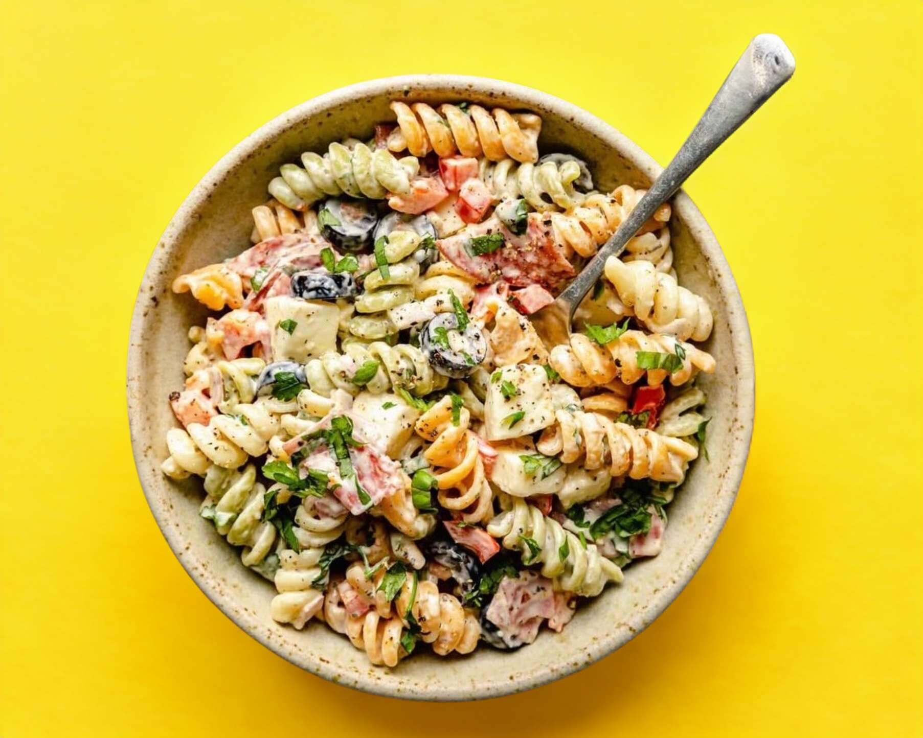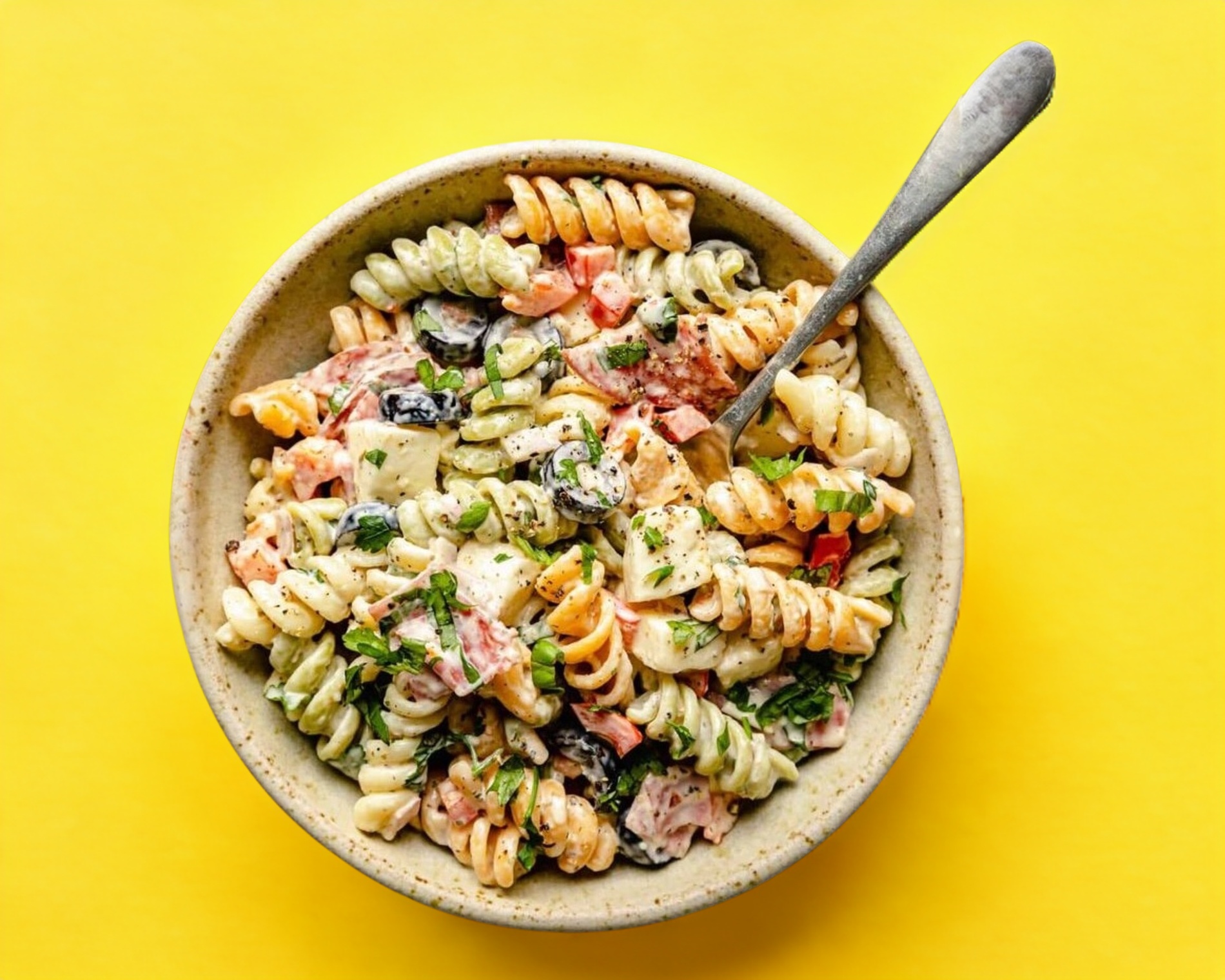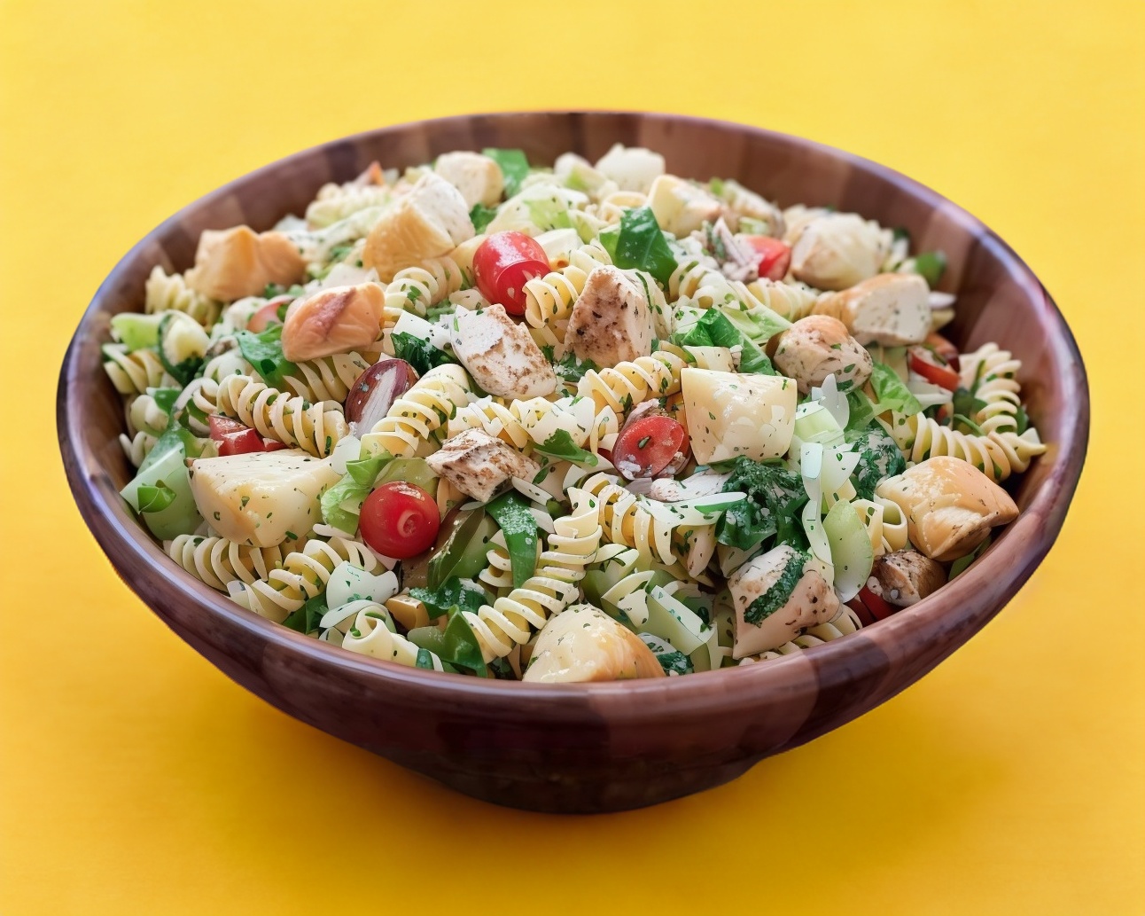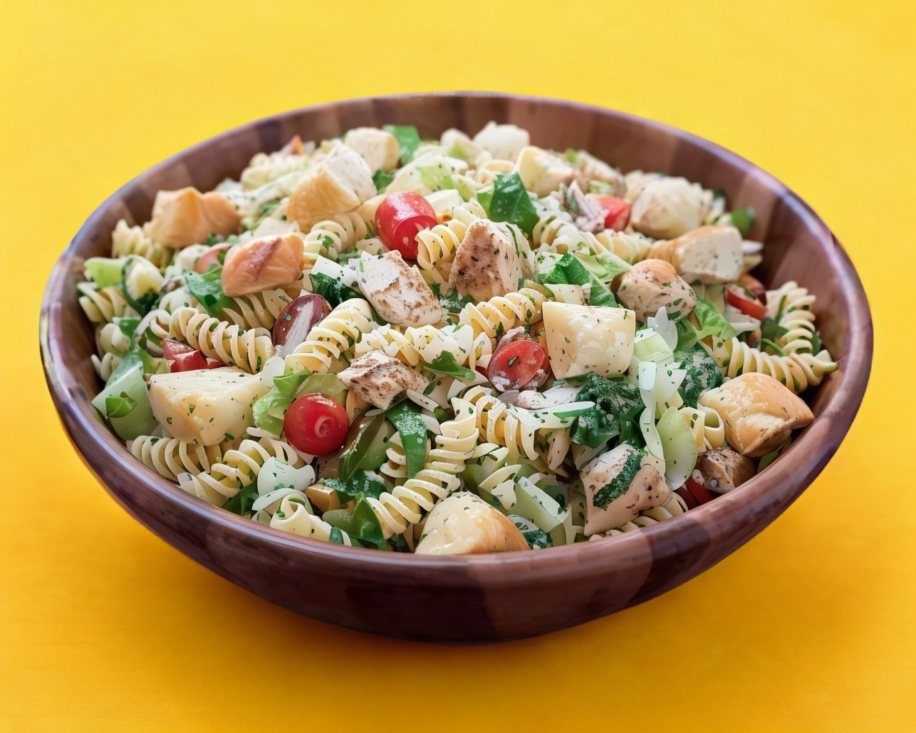 Pollo deshebrado, lechugas mixtas, jitomate, pasta, aderezo cesar, crotones y queso parmesano rayado.