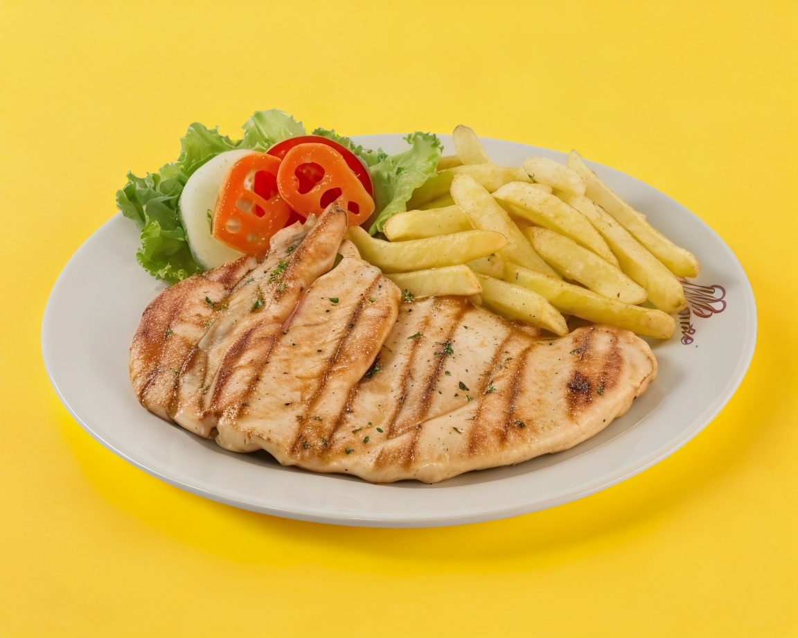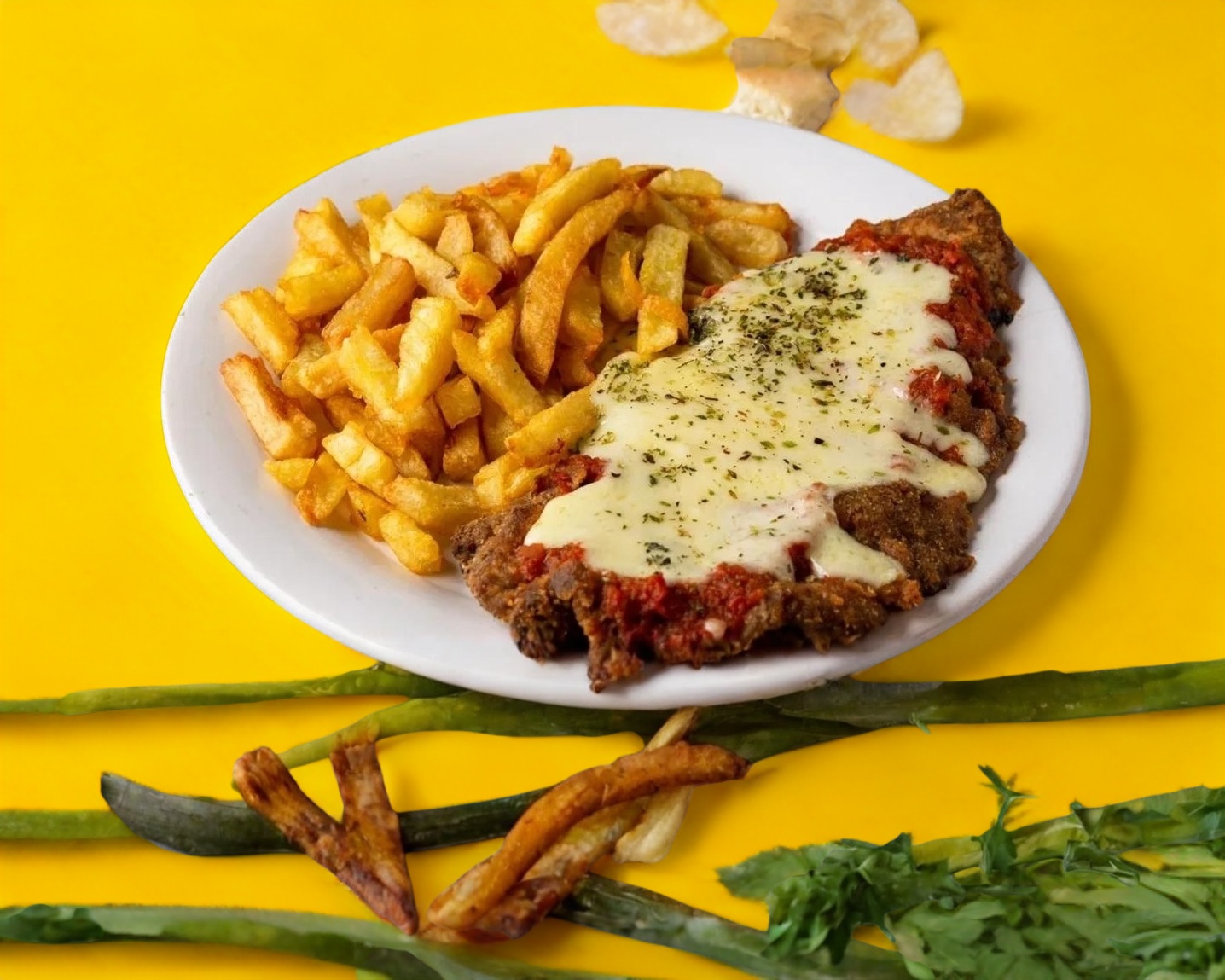 Frita con parmesano, jitomate asado, queso parmesano. Con guarnición de ensalada y papas a la francesa.