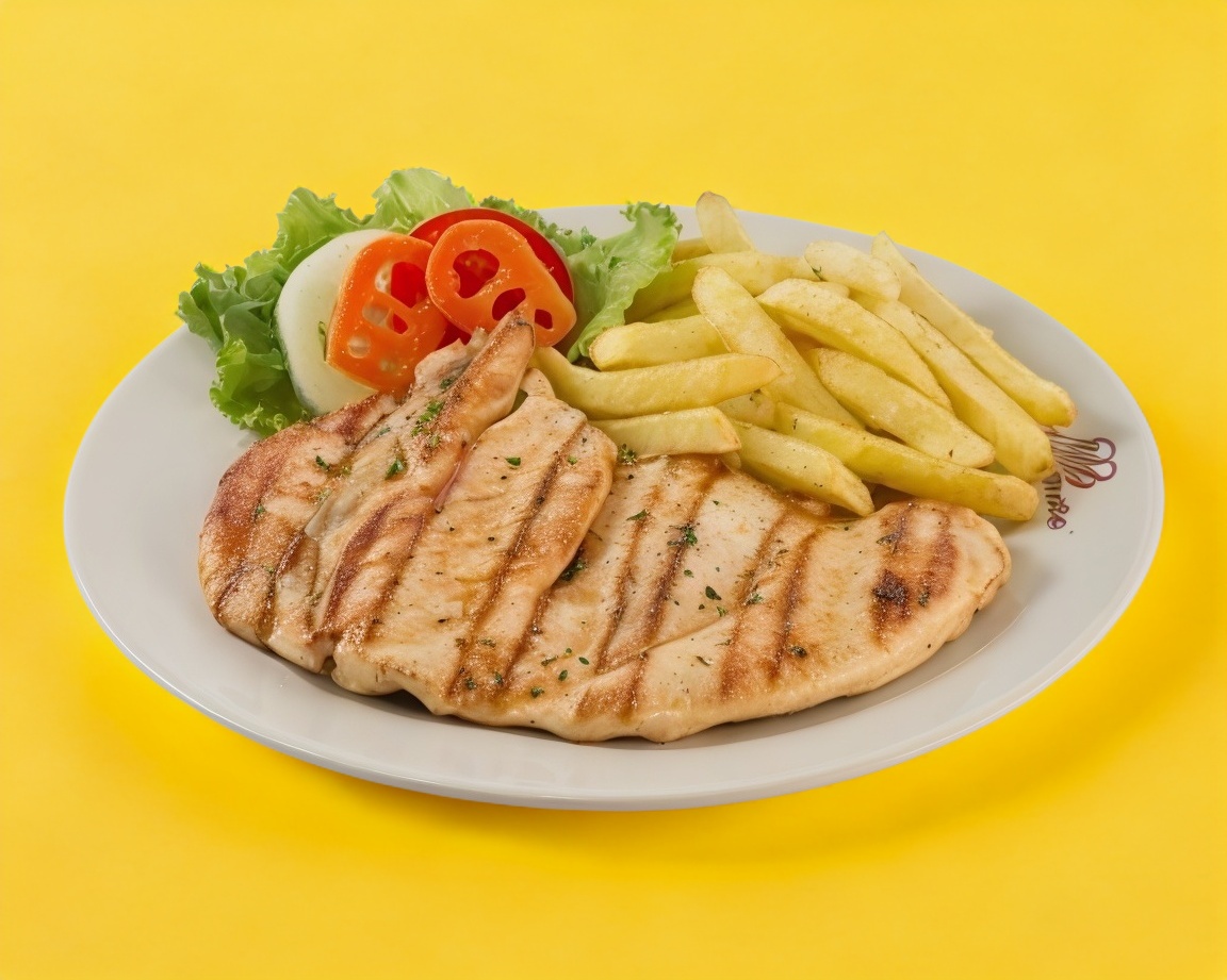 A la plancha. Con guarnición de ensalada y papas a la francesa.