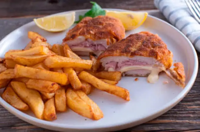 Empanizada, rellena de queso manchego y jamón. Con guarnición de ensalada y papas a la francesa.