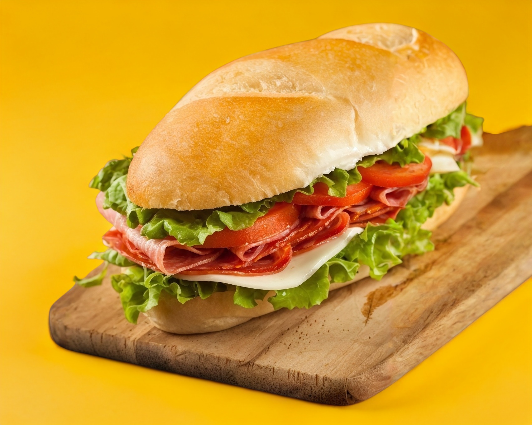 Pan Baguette con salsa italiana, pepperoni, queso manchego, lechuga, jitomate, cebolla y guarnición de papas a la francesa.