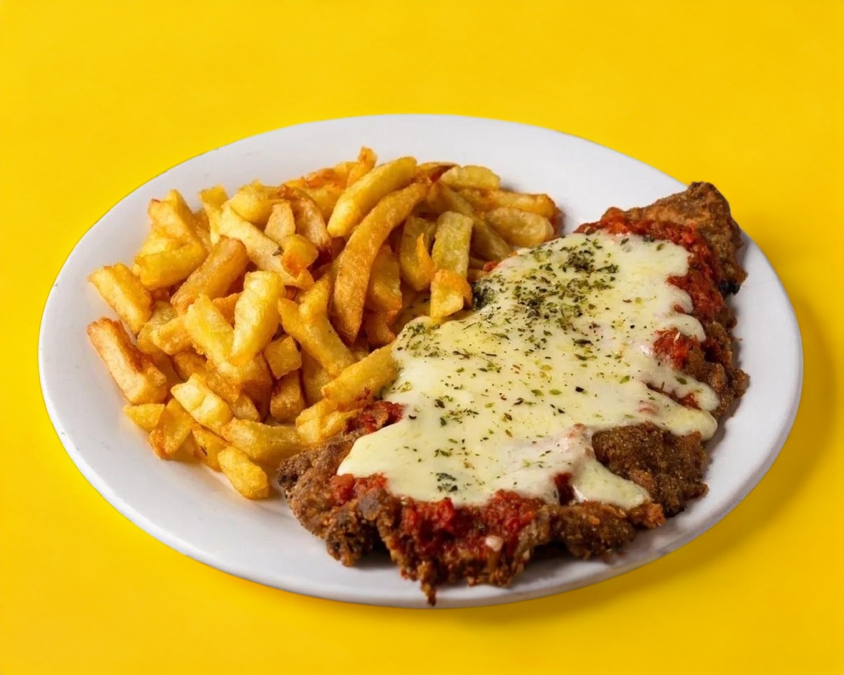 Empanizada, gratinada con salsa italiana. Con guarnición de ensalada y papas a la francesa.