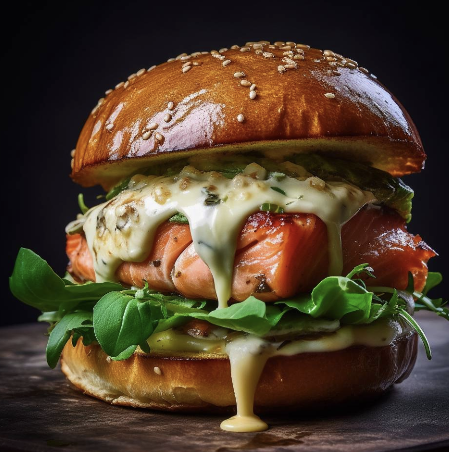 Hamburguesa de salmón en Pan Brioche, con nuestra salsa palermo de 4 quesos en su interior, con lechuga, nuez y manzana asada