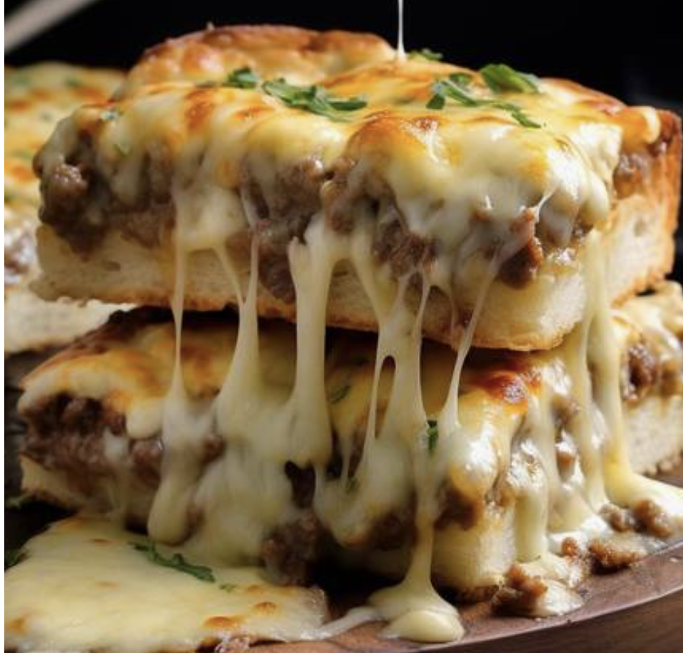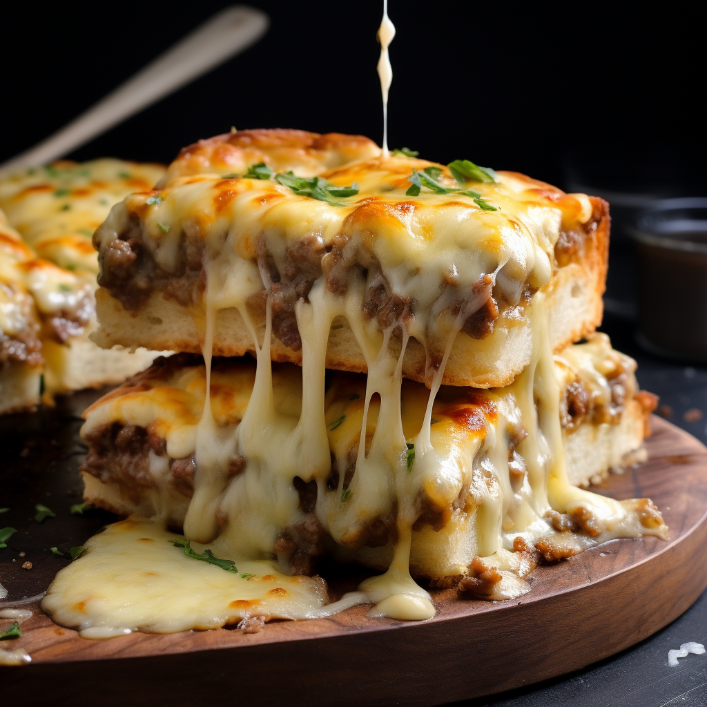 Tiras de focaccia con mezcla de quesos, Boloñesa y salsa de tomate de ajo rostizado