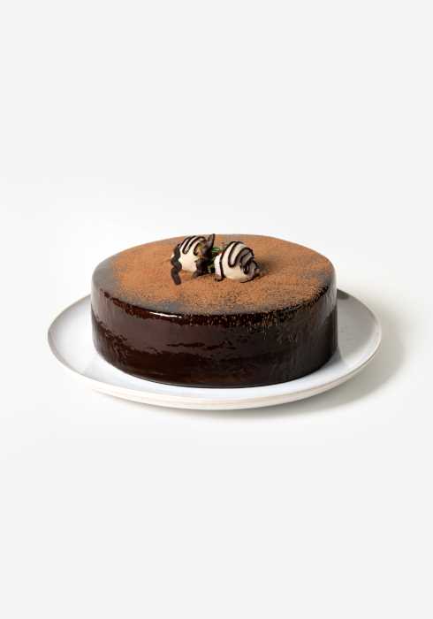 Pastel hecho a base de panque de chocolate con relleno y decorado de ganache de chocolate.