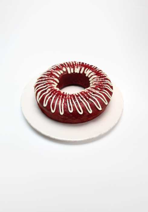 Rosca de panqué sabor red velvet con relleno de mermelada sabor zarzamora. Decorada con cobertura de queso.