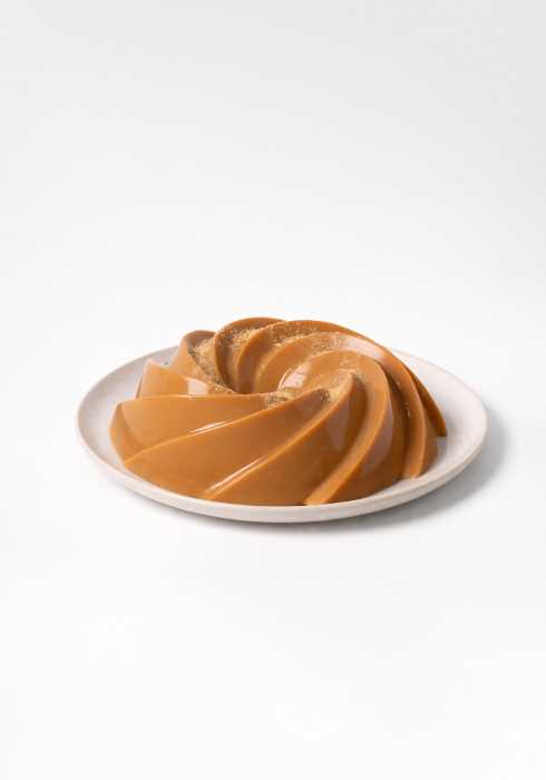 Flan horneado con caramelo líquido.