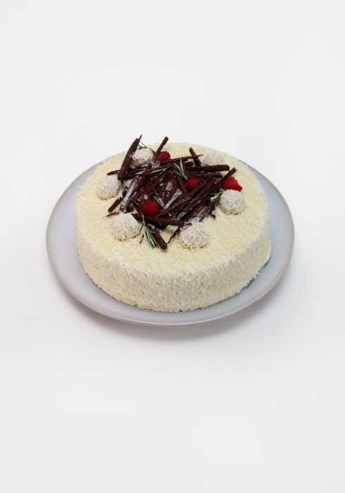 Pan sabor vainilla bañado en jarabe tres leches sabor rompope. Relleno de mousse de chocolate blanco y mermelada sabor frambuesa. Cubierto con ganache