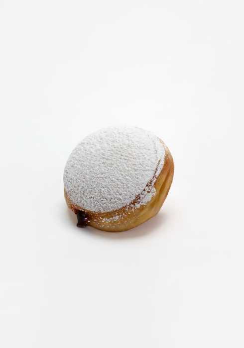 Dona rellena con jalea sabor frambuesa, decorada con cobertura espolvoreadas con azúcar glass.