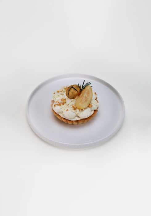 Tarta rellena con una crema de queso, mermelada sabor guayaba y feuilletine. Decorada con crema y guayaba fresca.