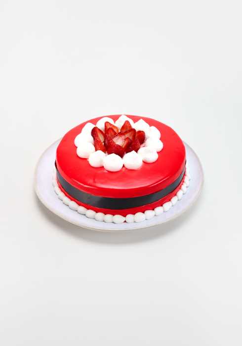 Pan de vainilla, relleno con fresa, bañado en tres leches. Decorado con chocolate y una fresa.