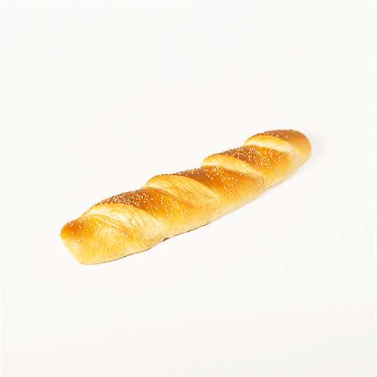 Pan salado de forma ovalada con dos incisiones a lo largo de su superficie de corteza crujiente, espolvoreada con ajonjolí.