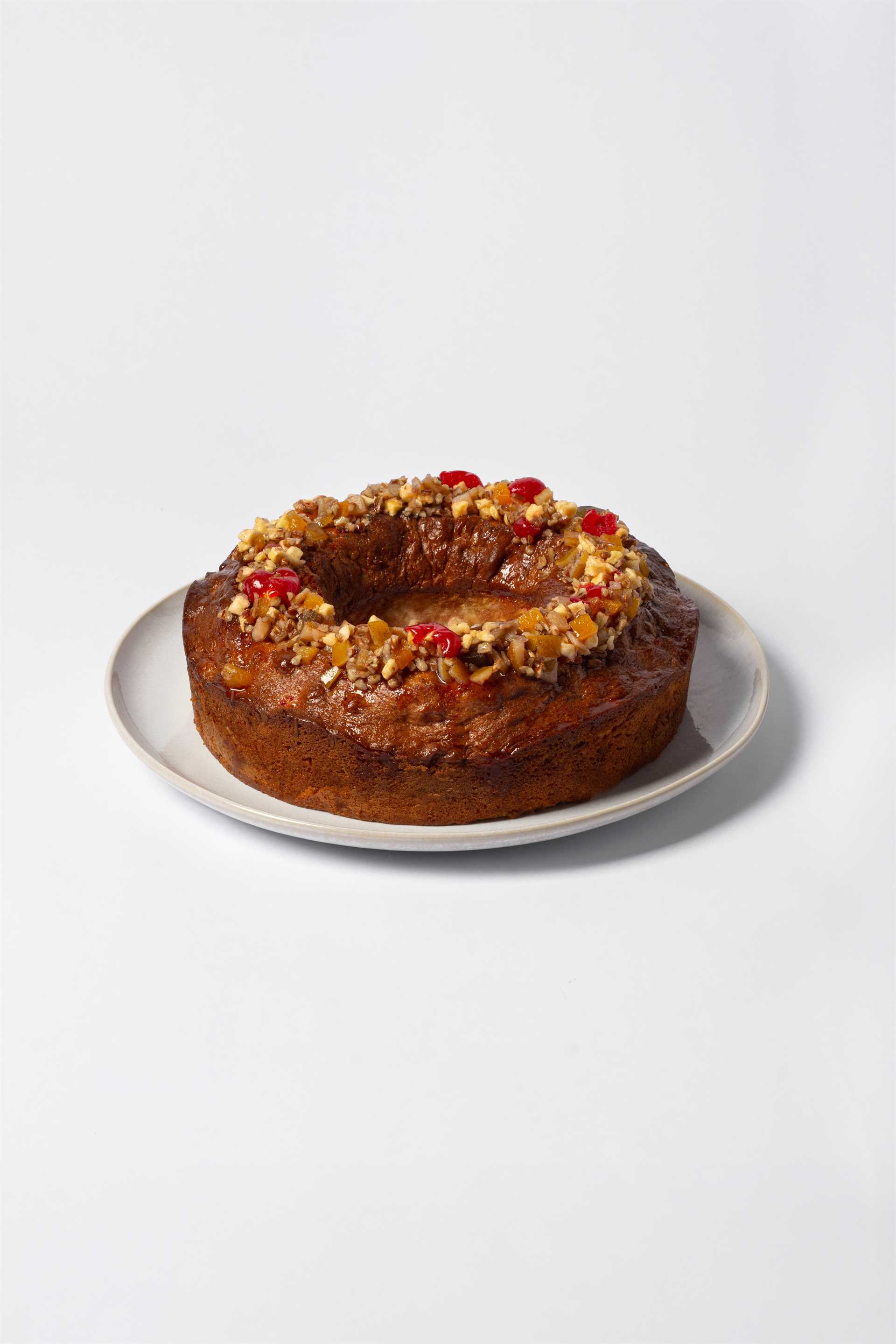 Rosca de panqué tradicional correspondiente a la temporada navideña con frutos secos, envinada con ron.