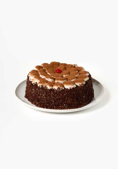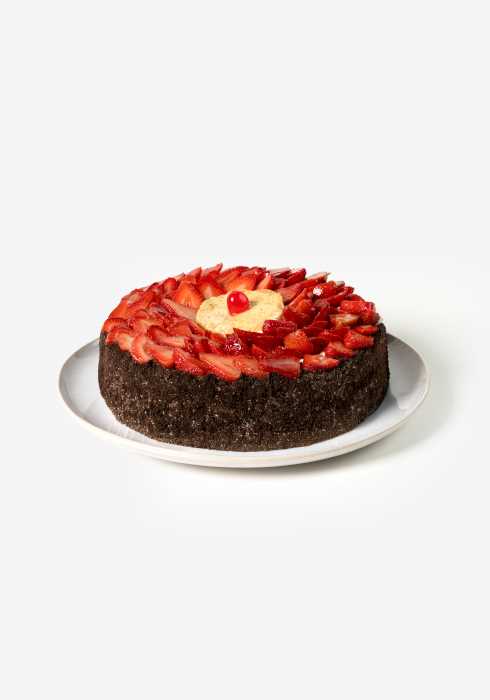 Pan de chocolate, bañado en tres leches, relleno de flan napolitano y trozos de nuez, decorado con fresa.
