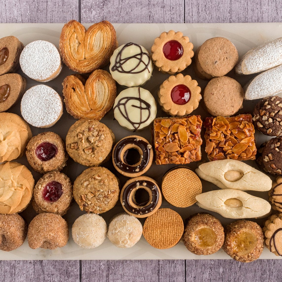 Base de galleta con nuez, capa fina de chocolate, relleno de crema pastelera y cobertura de frutas.