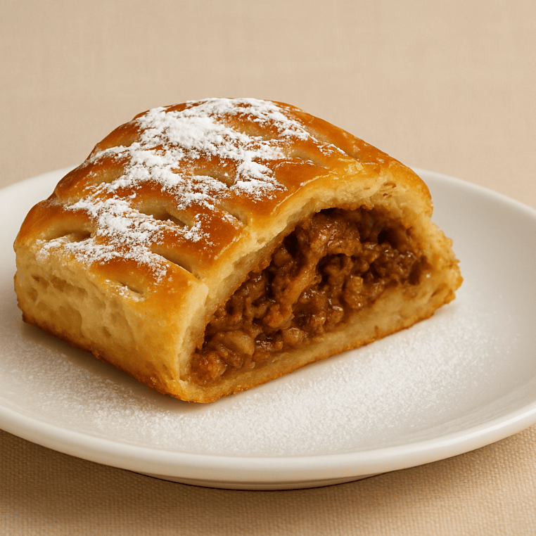 6 Rebanadas. Pasta hojaldre, relleno de manzana con canela y nuez.