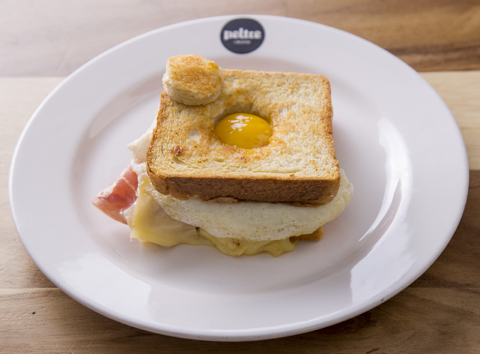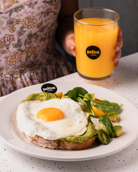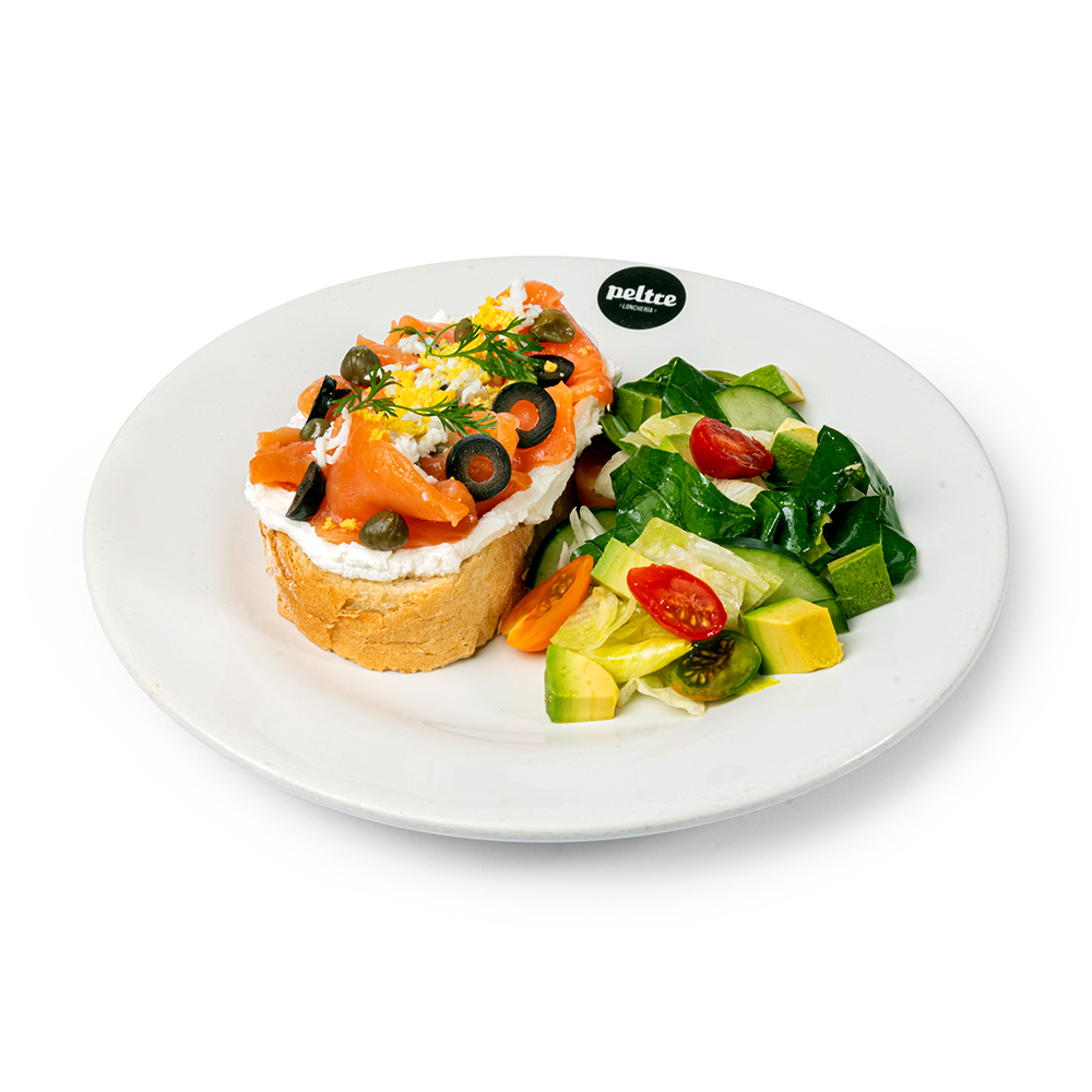 260 g. En una rebanada de pan de hogaza, servido con salmón curado artesanalmente en nuestra cocina, con jocoque, ralladura de huevo cocido, aceituna negra y alcaparras, acompañado de ensalada verde y vinagreta Peltre.