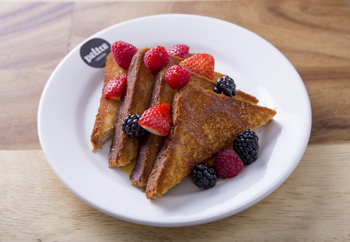 280 g. Pan brioche sumergido en leche francesa, espolvoreado en azúcar canela, acompañado de jarabe de maple y frutos rojos.