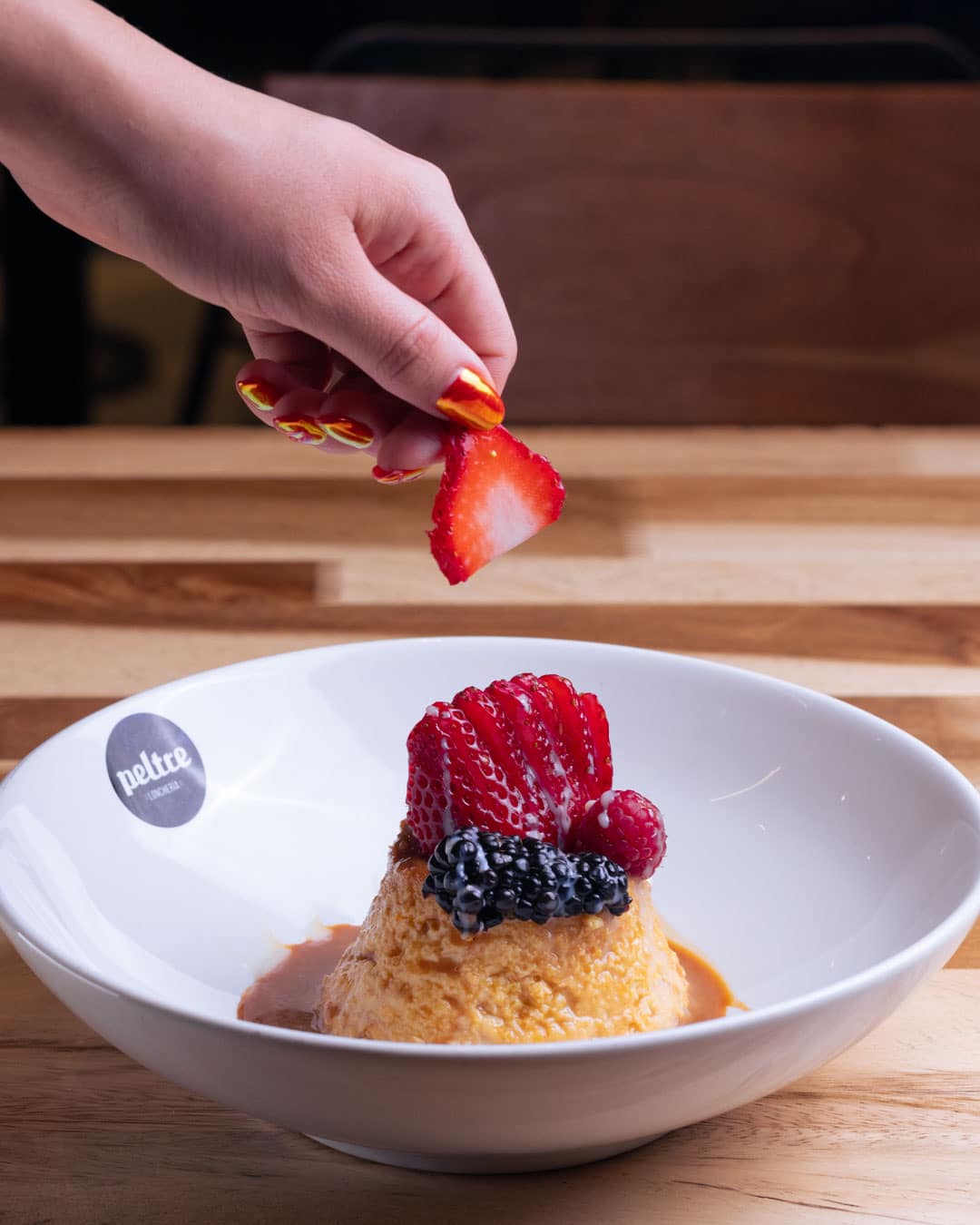 140 g. Flan de elote con salsa de cajeta, leche condensada y frutos rojos.