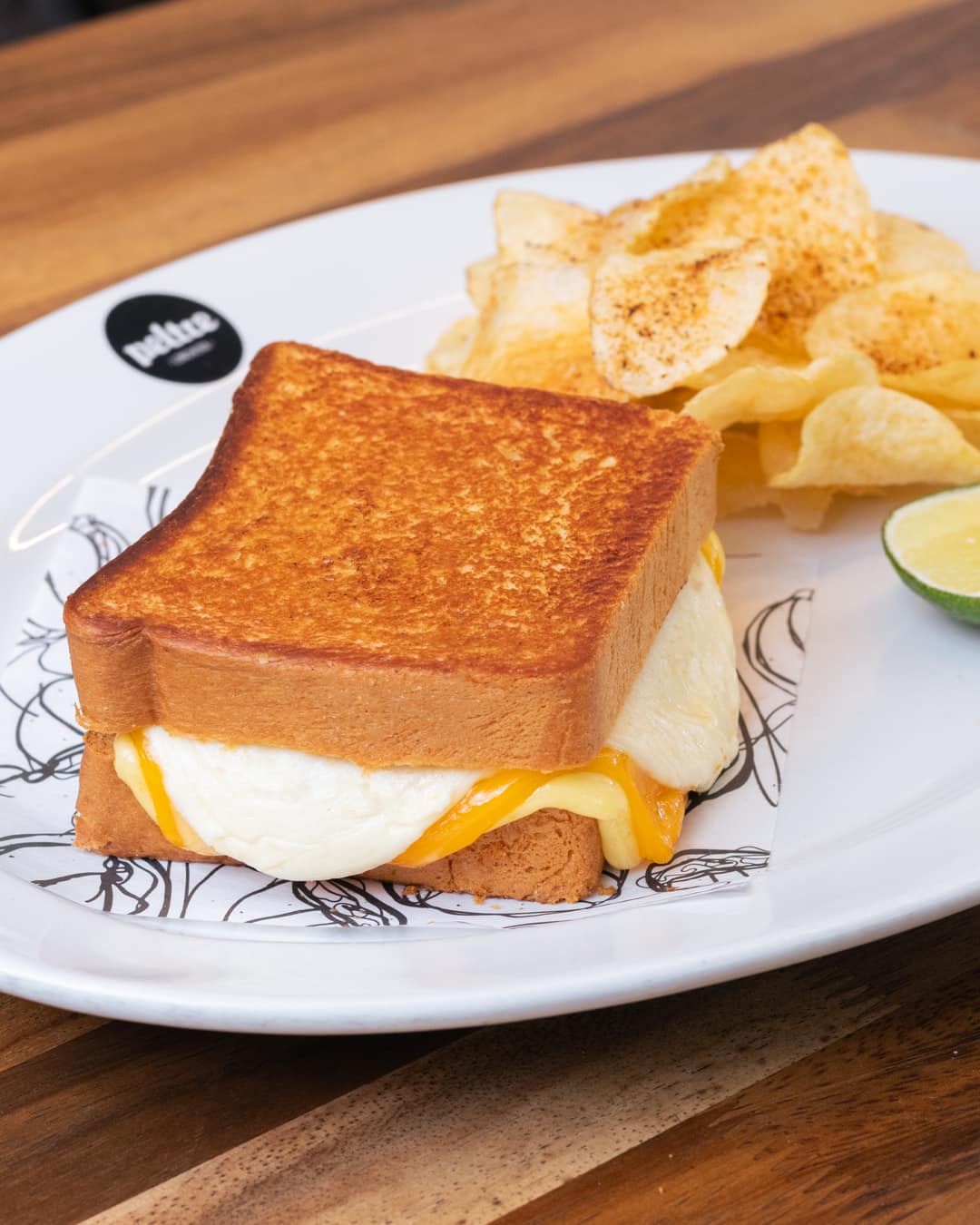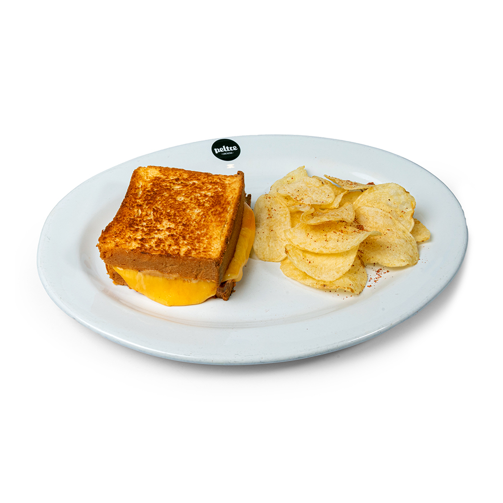 270 g. Sándwich con queso cheddar, mix de queso y queso gouda gratinados, con mayonesa de chipotle en pan brioche hecho en casa, acompañado de papas crujientes con polvo de chiles.