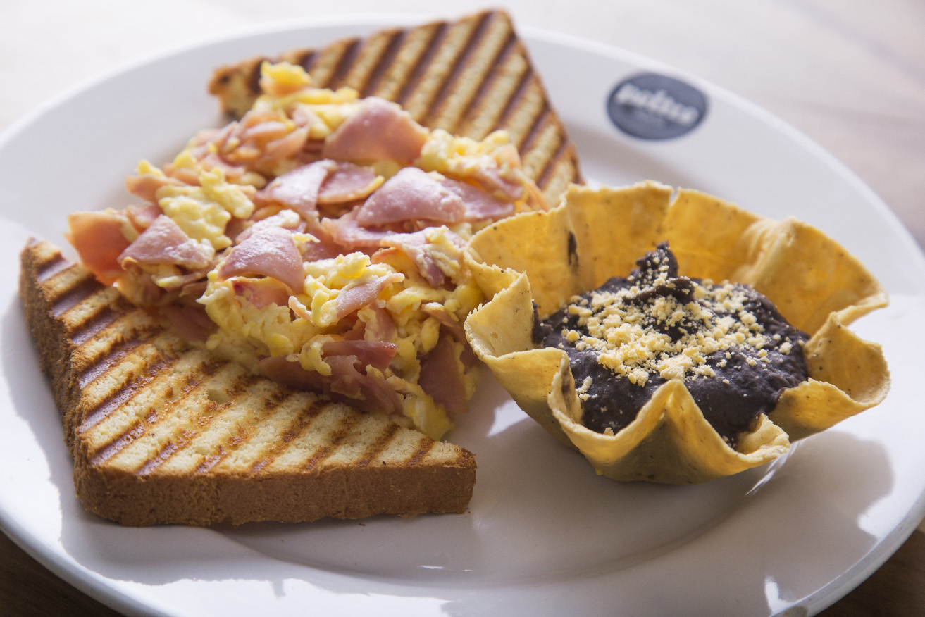 250 g. Huevos revueltos con jamón de pavo, acompañados de frijoles refritos con queso chiapas y una rebanada de pan de caja hecho en casa.