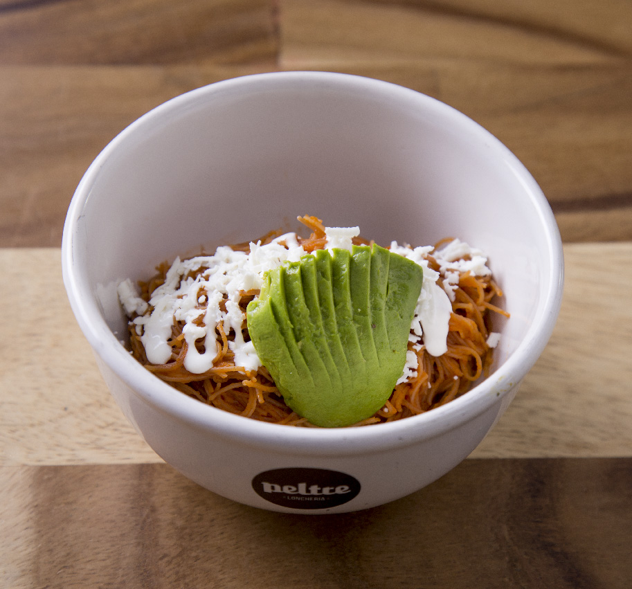 250 g. Fideo seco con crema fresca, queso fresco, aguacate y cilantro.