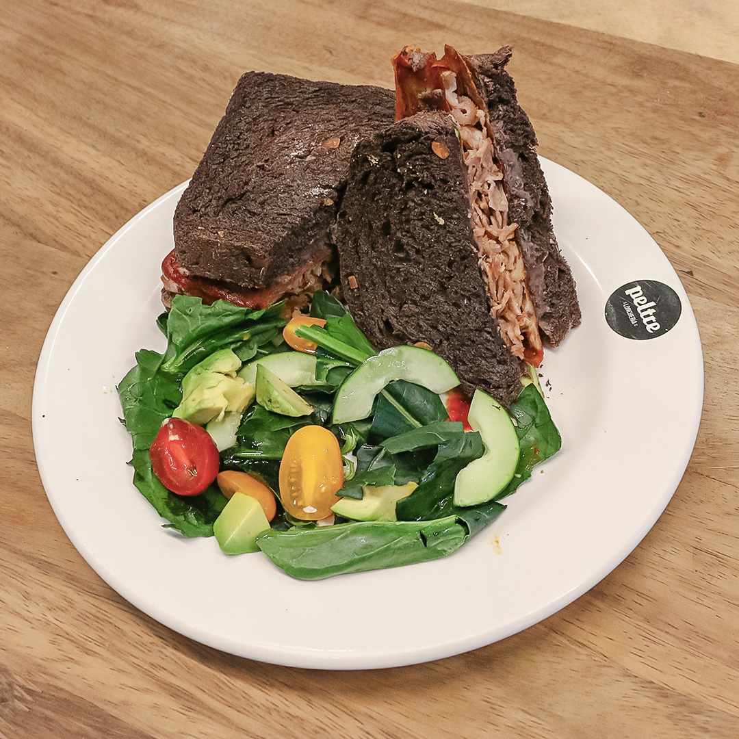 270 g. Sándwich con costra de queso, chile chipotle, aguacate y frijoles refritos en pan de cacao con nuez de la india hecho en casa, acompañado con ensalada verde con vinagreta peltre.