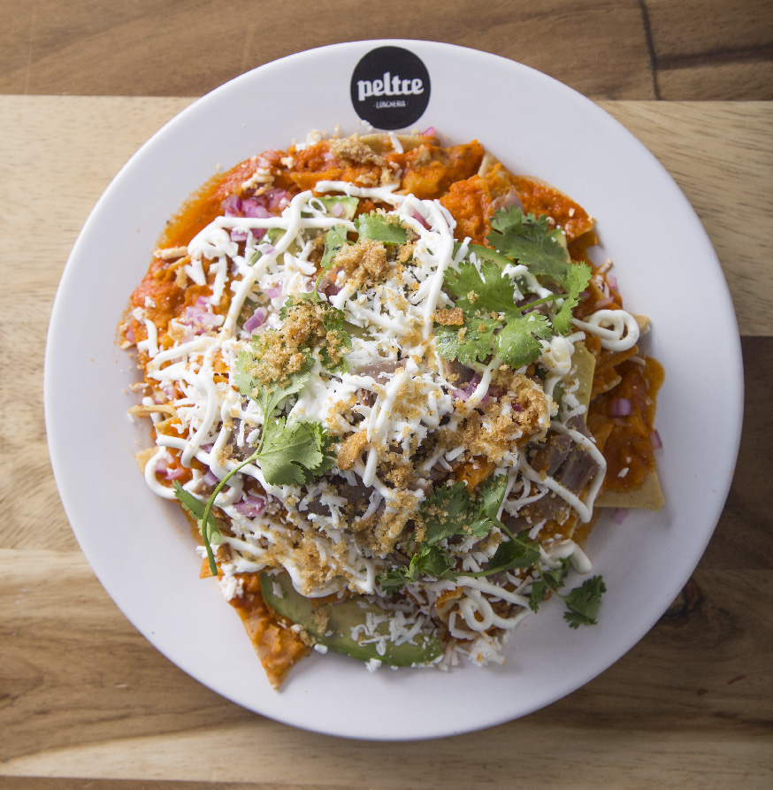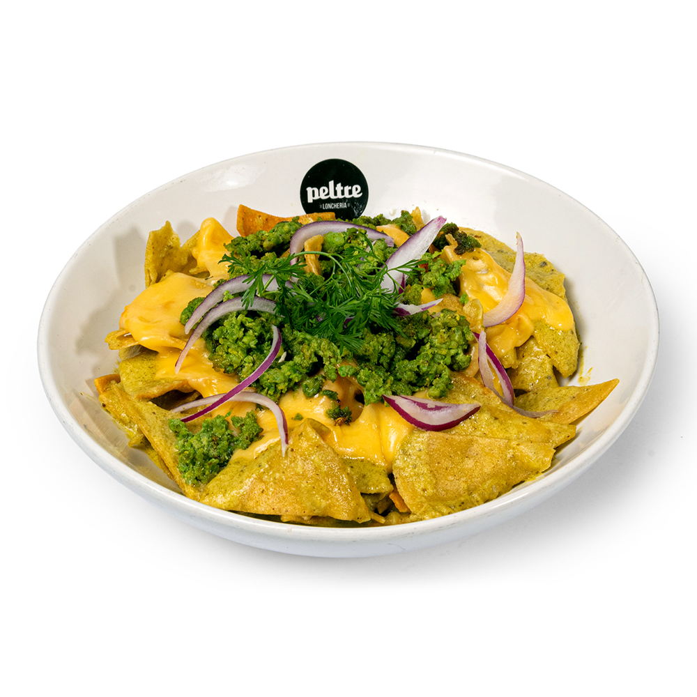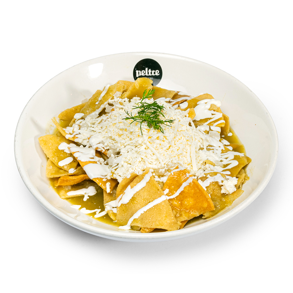 600 g. Chilaquiles con queso fresco, cebolla morada, crema, cilantro, aguacate y polvo de chicharrón.
