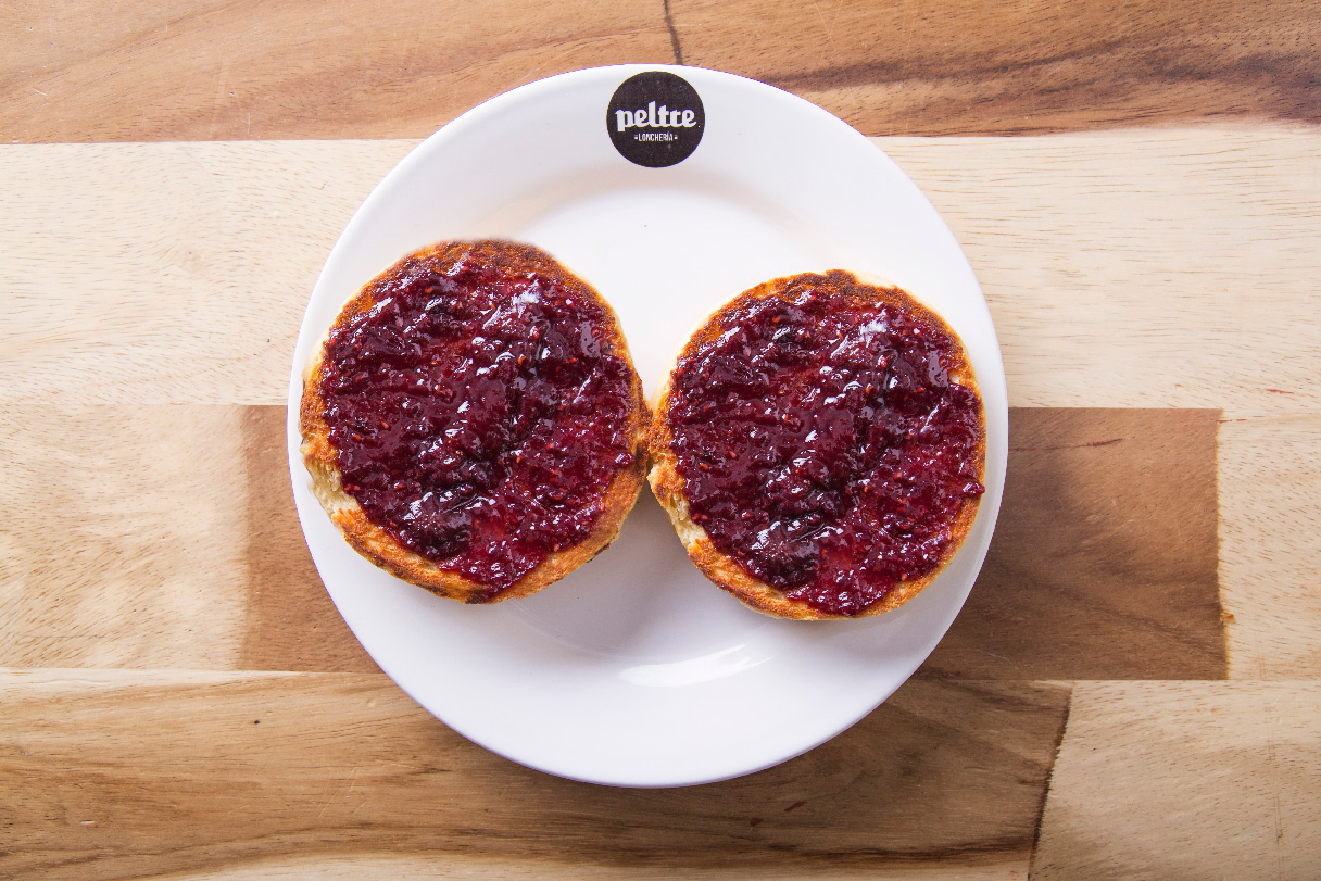 140 g. Bísquet partido en dos, a la plancha con mantequilla, acompañado de mermelada de la casa.