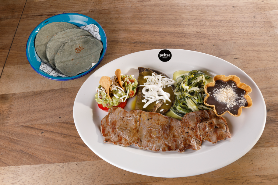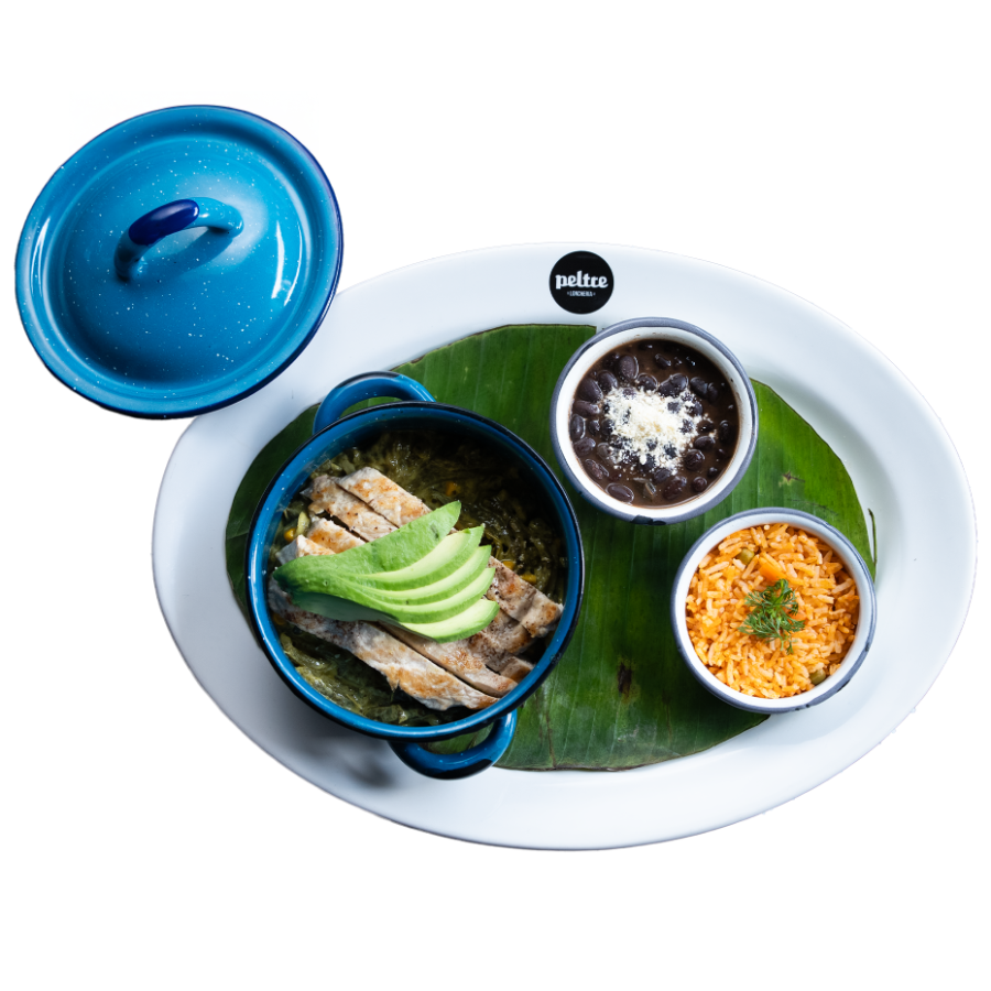 290 g. Tiras de chile poblano con crema, granos de elote y fajitas de pollo asado. Acompañada con arroz, frijoles de la olla y tortillas de maíz.