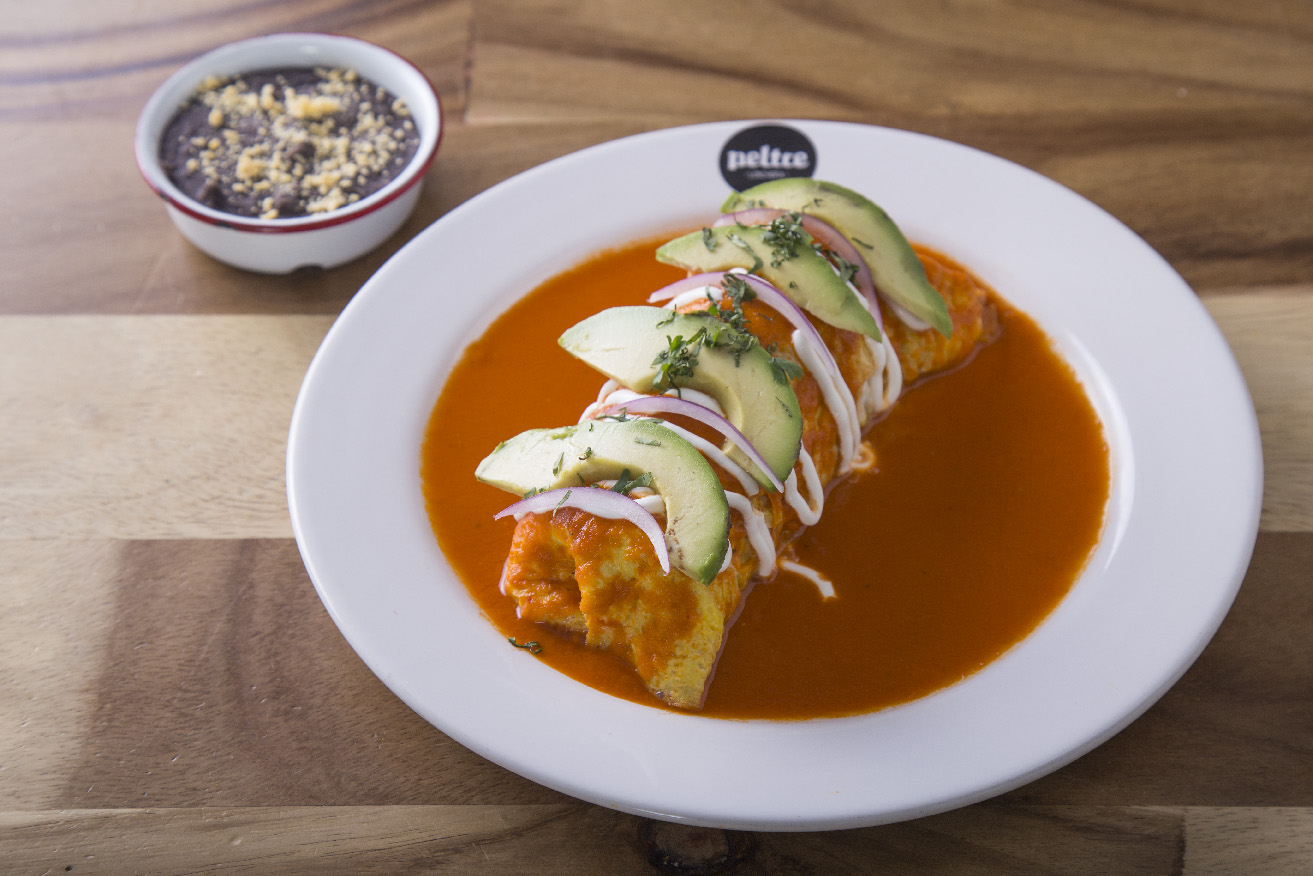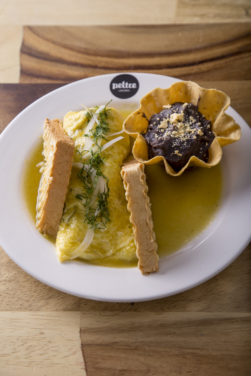 270 g. Huevos en omelette relleno con chilaquiles de salsa de chile cascabel, polvo de chicharrón y queso fresco, bañado con salsa de chile cascabel, aguacate, cebolla morada, cilantro y crema; acompañado de frijoles refritos con queso chiapas.