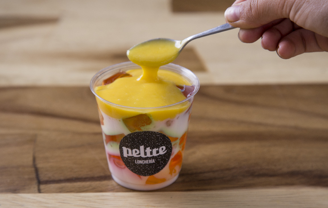 C160 g. Cubos de gelatinas de varios sabores acompañada de salsa cremosa de mango.