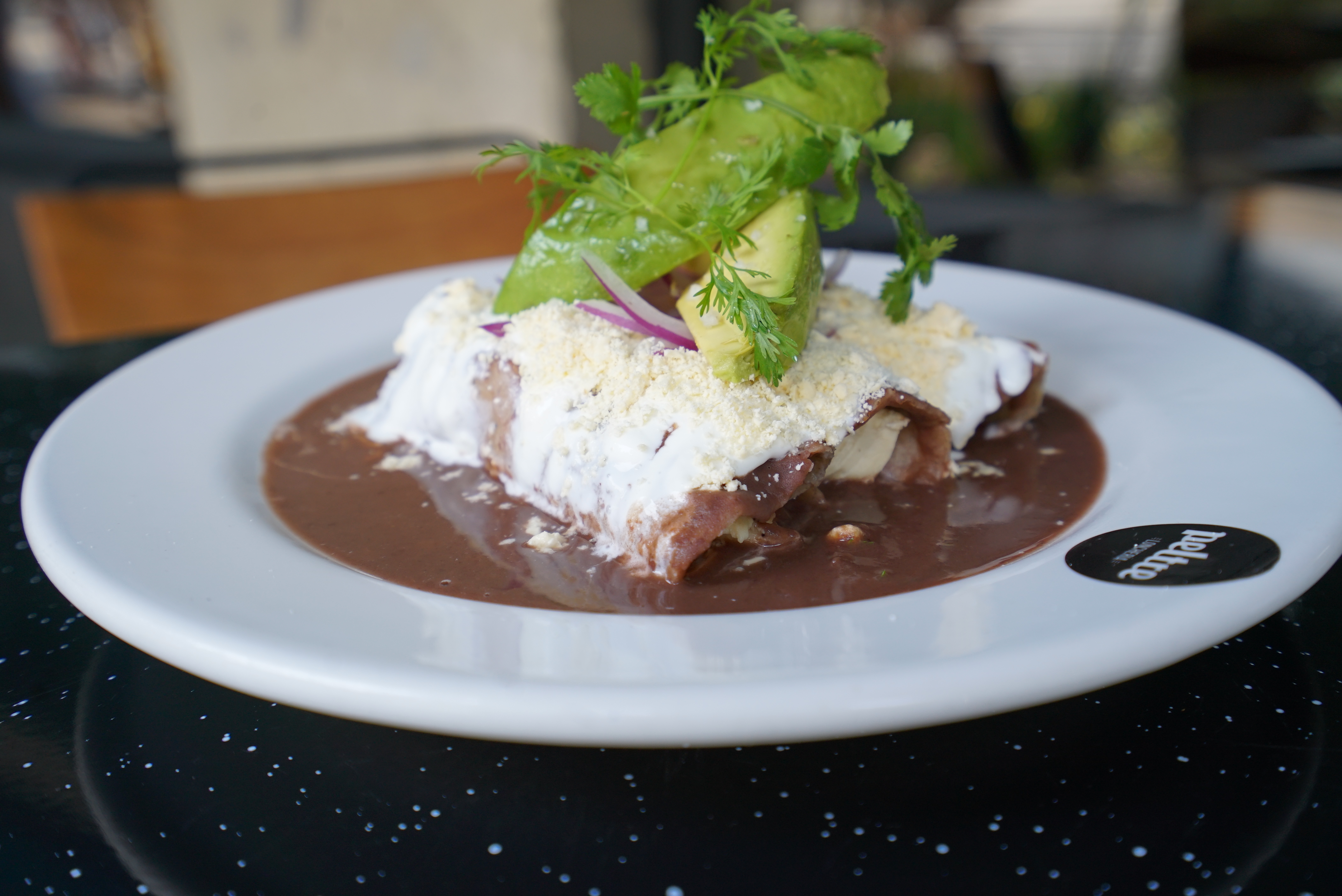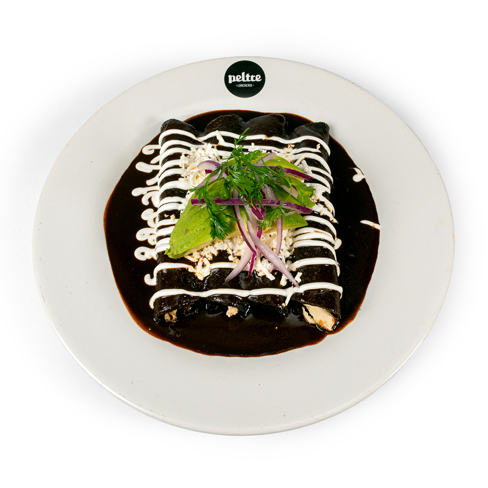 390 g. Cuatro enmoladas rellenas a tu elección (pollo, queso panela o huevo),, queso fresco, crema, cebolla blanca, cilantro y aguacate.