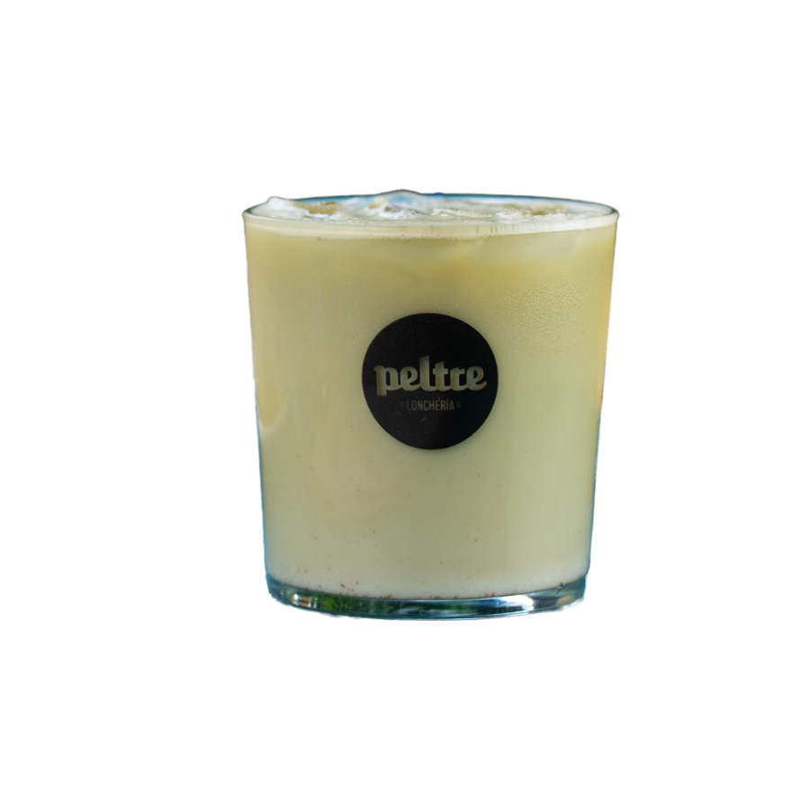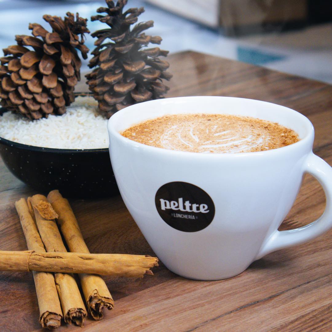 Esencia de arroz en polvo con leche cremada, muy espumosa y agua, acompañado con canela en polvo.