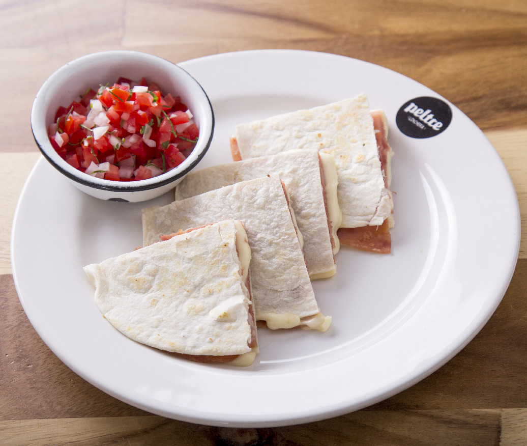 250 g. Tortilla de harina rellenas de quesillo y jamón de pavo, acompañadas con salsa mexicana.