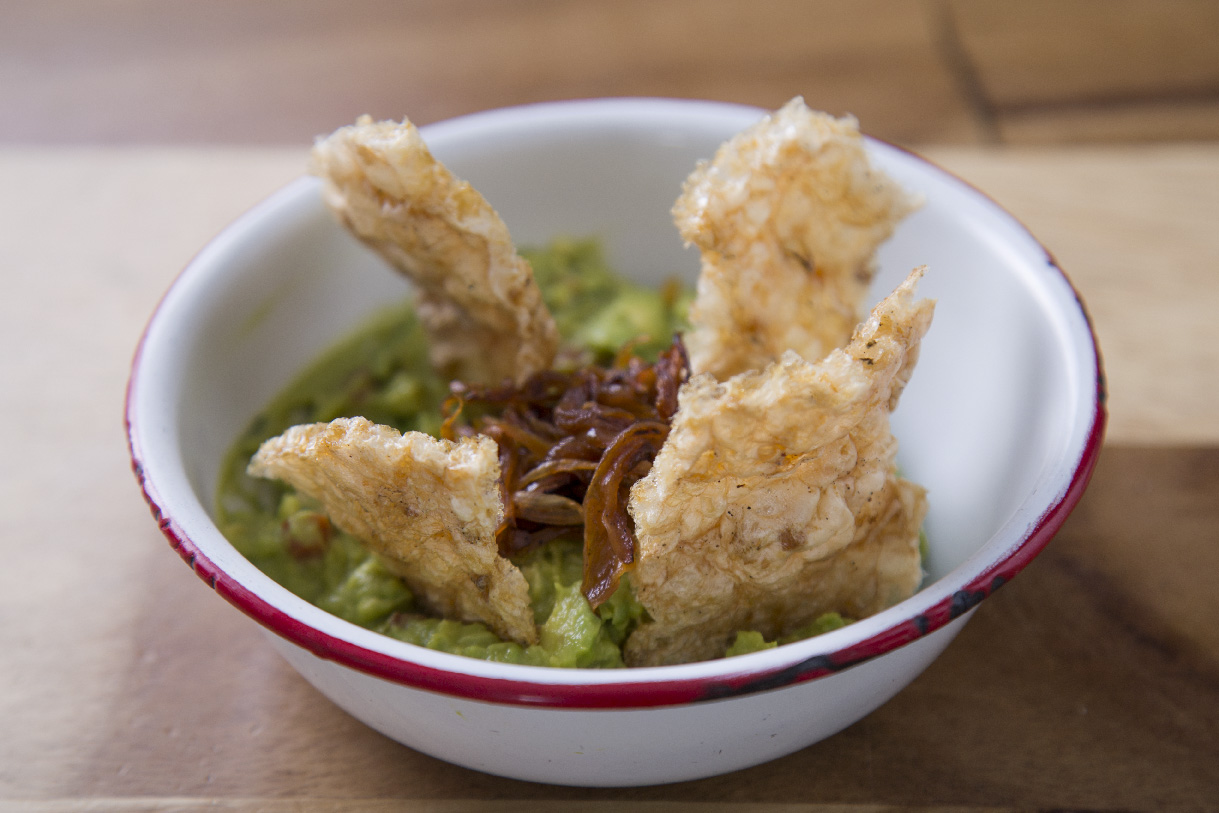 200 g. Guacamole con jitomate, cebolla blanca y chile manzano, decorado con cebolla caramelizada y chicharrón seco o totopos.