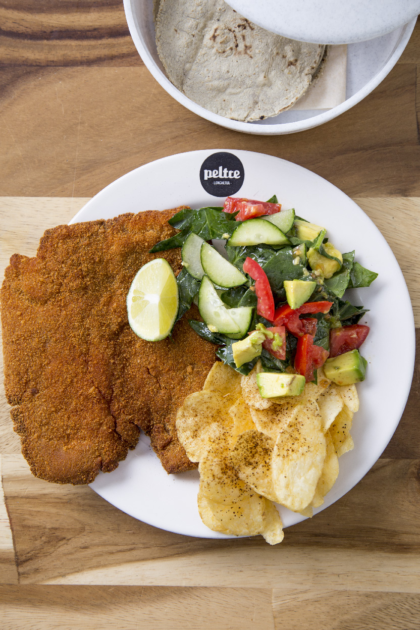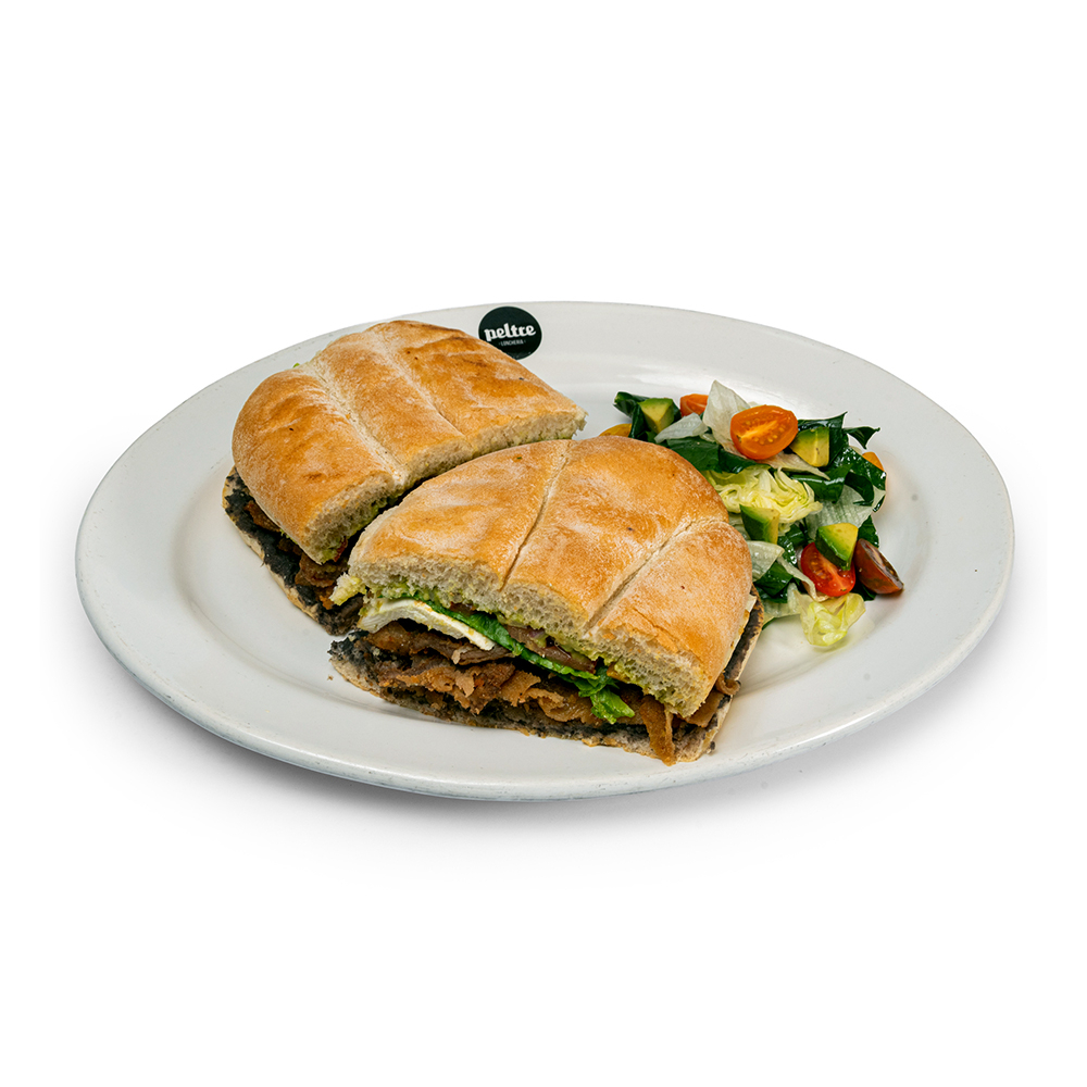 400 g. Torta de milanesa de res con jitomate, cebolla, frijoles refritos, guacamole, lechuga y queso panela, acompañada con ensalada verde y vinagreta peltre.